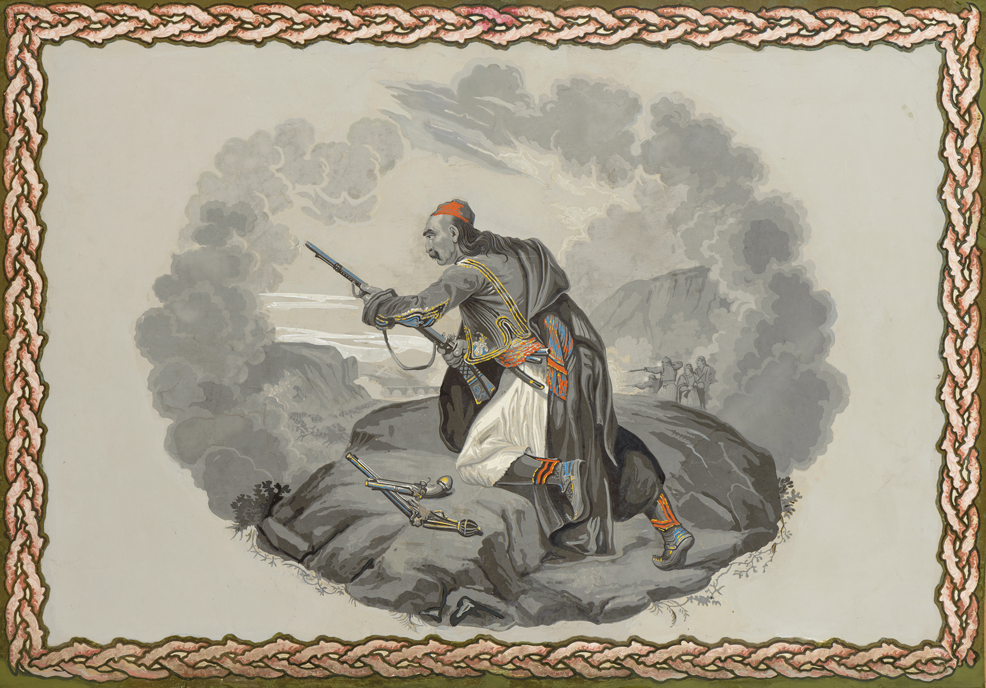 Περιγραφή: Ταπετσαρία τοίχου (αναγλυφοτυπία) γαλλικής κατασκευής, με Έλληνα αγωνιστή. Εικονίζεται ολόσωμος, γονατισμένος και οπλισμένος, δείχνει να είναι σε ενέδρα. Το θέμα παραπέμπει σε έργο του Henri Decaisne (1826). Συντηρημένη.