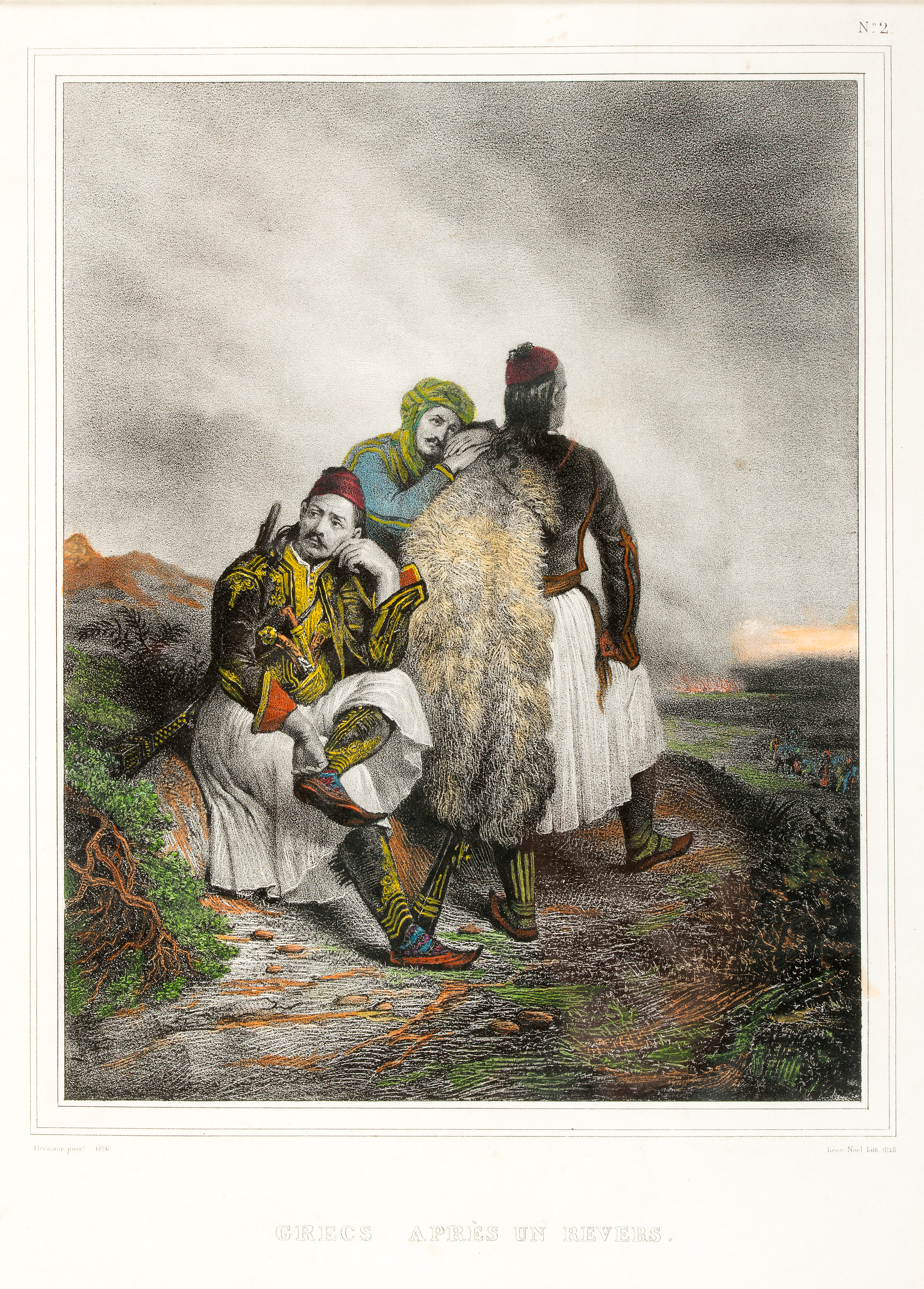 Περιγραφή: Λιθογραφία επιζωγραφισμένη με το χέρι, γαλλικής έκδοσης, με την ένδειξη κάτω στο κέντρο: GRECS APRÈS UN REVERS (Έλληνες μετά από αποτυχημένο εγχείρημα), βασισμένη σε πίνακα του H. Decaisne. Κάτω αριστερά: Decaisne pinx! 1826, πιο κάτω: Paris chez Fontaine, Boulevard St. Martin, No31. Κάτω δεξιά: Léon Noël Lith. 1828 και πιο κάτω: Litho. de Benard. Επάνω δεξιά, φέρει τον αριθμό 2. Εικονίζεται η γνωστή σκηνή, που έχει φιλοτεχνήσει ο Decaisne, με τους απογοητευμένους Έλληνες και που έχει αναπαραχθεί και σε φιλελληνικά πιάτα της Toulouse.