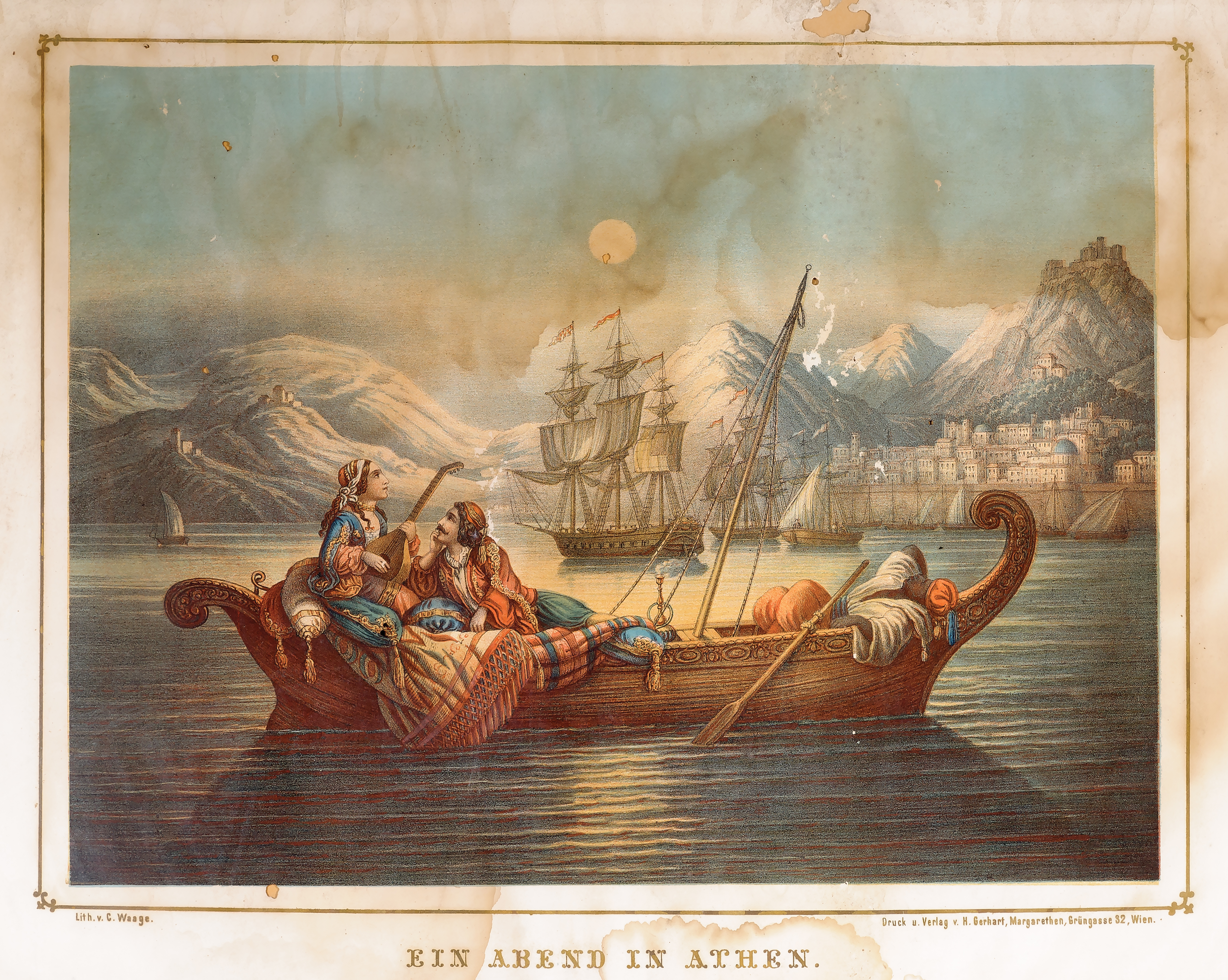 Περιγραφή: Χρωμολιθογραφία του C.Waage, που τυπώθηκε και δημοσιεύτηκε από τον H.Gerhard στη Βιέννη, με τίτλο: EIN ABEND IN ATHEN (Ένα Δειλινό στην Αθήνα). Φανταστική και με έντονα στοιχεία ρομαντισμού και οριενταλισμού απεικόνιση ζεύγους, μέσα σε βάρκα, υπό το σεληνόφως.