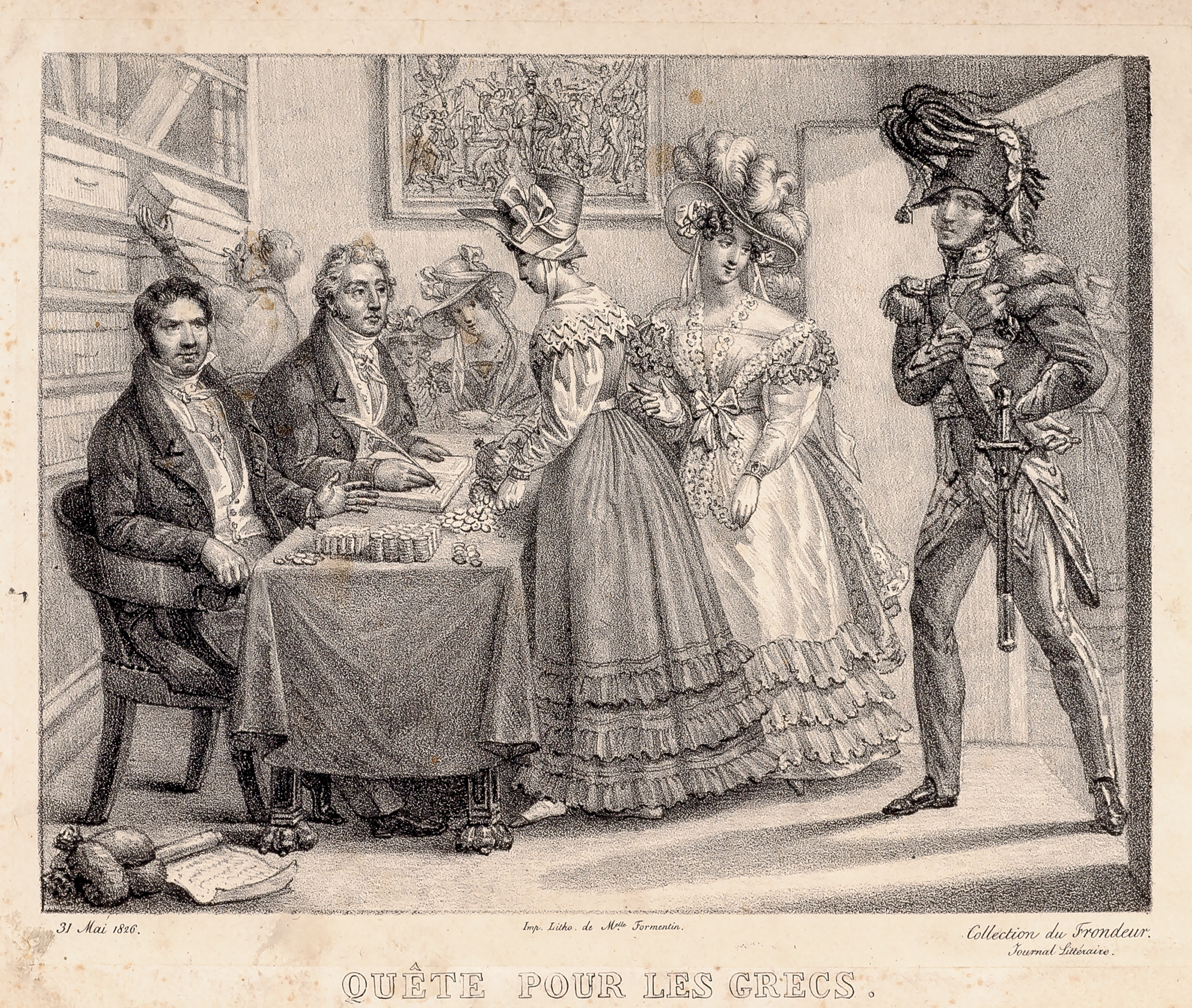 Περιγραφή: Ασπρόμαυρη λιθογραφία, γαλλικής κατασκευής, με τίτλο: QUÊTE POUR LES GRECS (Έρανος για τους Έλληνες). Πολυπρόσωπη σύνθεση με θέμα συλλογή χρημάτων. Κάτω αριστερά: 31 Mai 1826., στο κέντρο: Imp. Litho. de Melle Formentin. και δεξιά: Collection du Frondeur. Journal Litteraire.