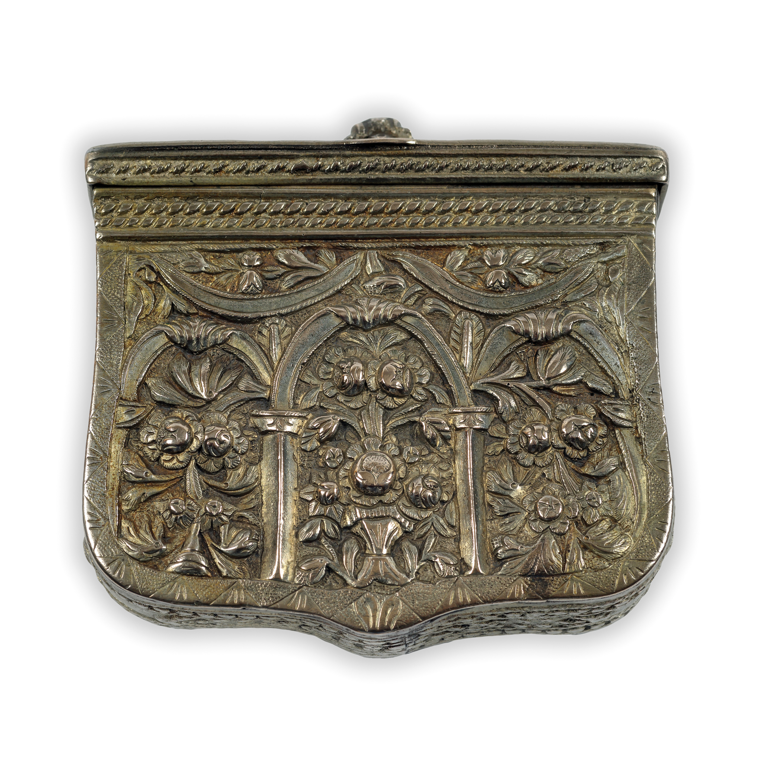 Περιγραφή: Ασημένια ελληνική παλάσκα με έξεργο χυτό και καλεμιστό φυτικό διάκοσμο μέσα σε τρεις αψίδες, που σχηματίζονται από τέσσερις κίονες. Πάνω από τις αψίδες, δύο ταινίες που περικλείουν άνθη. Στο πάνω μέρος της όλης άνθινης σύνθεσης, δύο σειρές από σχοινόμορφη διακόσμηση, που συνεχίζεται με μία τρίτη στο κάτω μέρος του καλύμματος. Το κάλυμμα, με μικρή επίστεψη, με παρόμοιο φυτικό διάκοσμο.