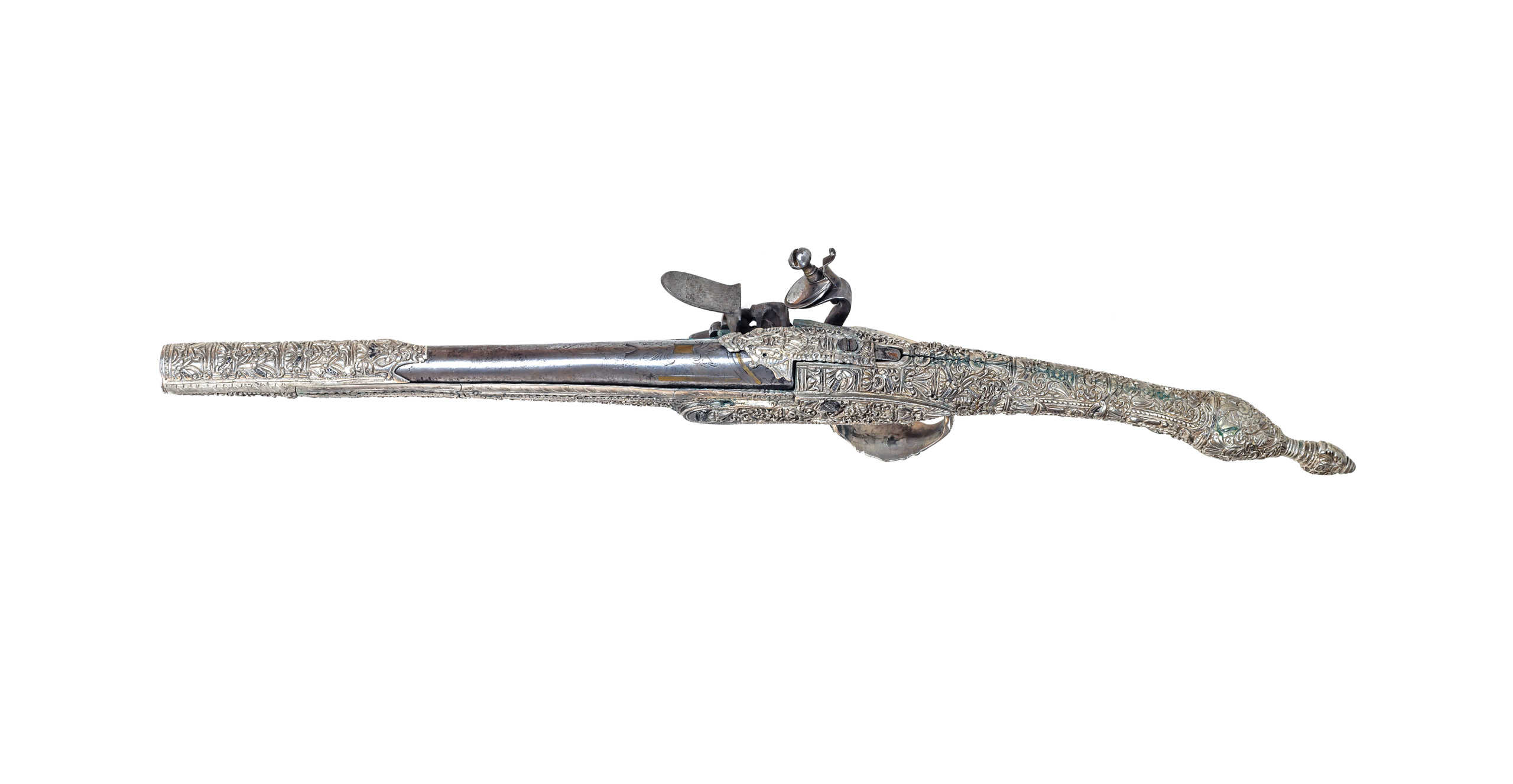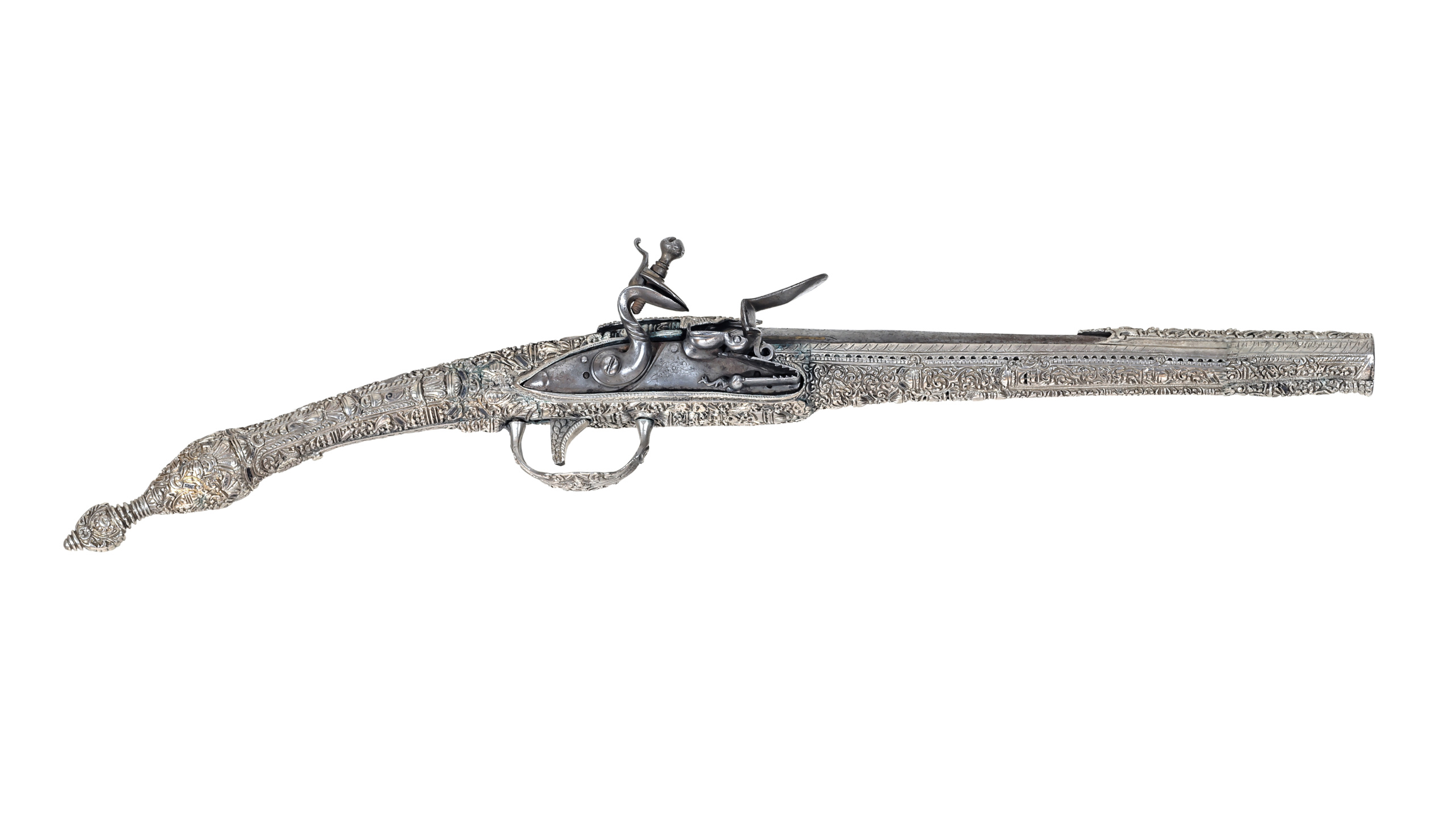 Περιγραφή: Ασημένια Ηπειρώτικη πιστόλα, με πλούσιο διάκοσμο. Ο διάκοσμος είναι έξεργος, καλεμιστός, λεπτοδουλεμένος και έχει άνθη, ρόδακες και σχηματοποιημένα διακοσμητικά μοτίβα. Η λαβή του όπλου, σχεδόν ευθεία, καταλήγει σε επίμηκες κωνοειδές πόμολο με έξι δακτυλίους στην άκρη και “κυπαρισσοειδή” απόληξη. Η ατσάλινη κάννη είναι λεία και κυλινδρική και φέρει εγχάρακτο στυλιζαρισμένο διάκοσμο με ίχνη επιχρύσωσης. Η σκανδάλη έχει έξεργη απλή διακόσμηση. Ο πυροδοτικός με πυρόλιθο μηχανισμός είναι ευρωπαϊκής προέλευσης.