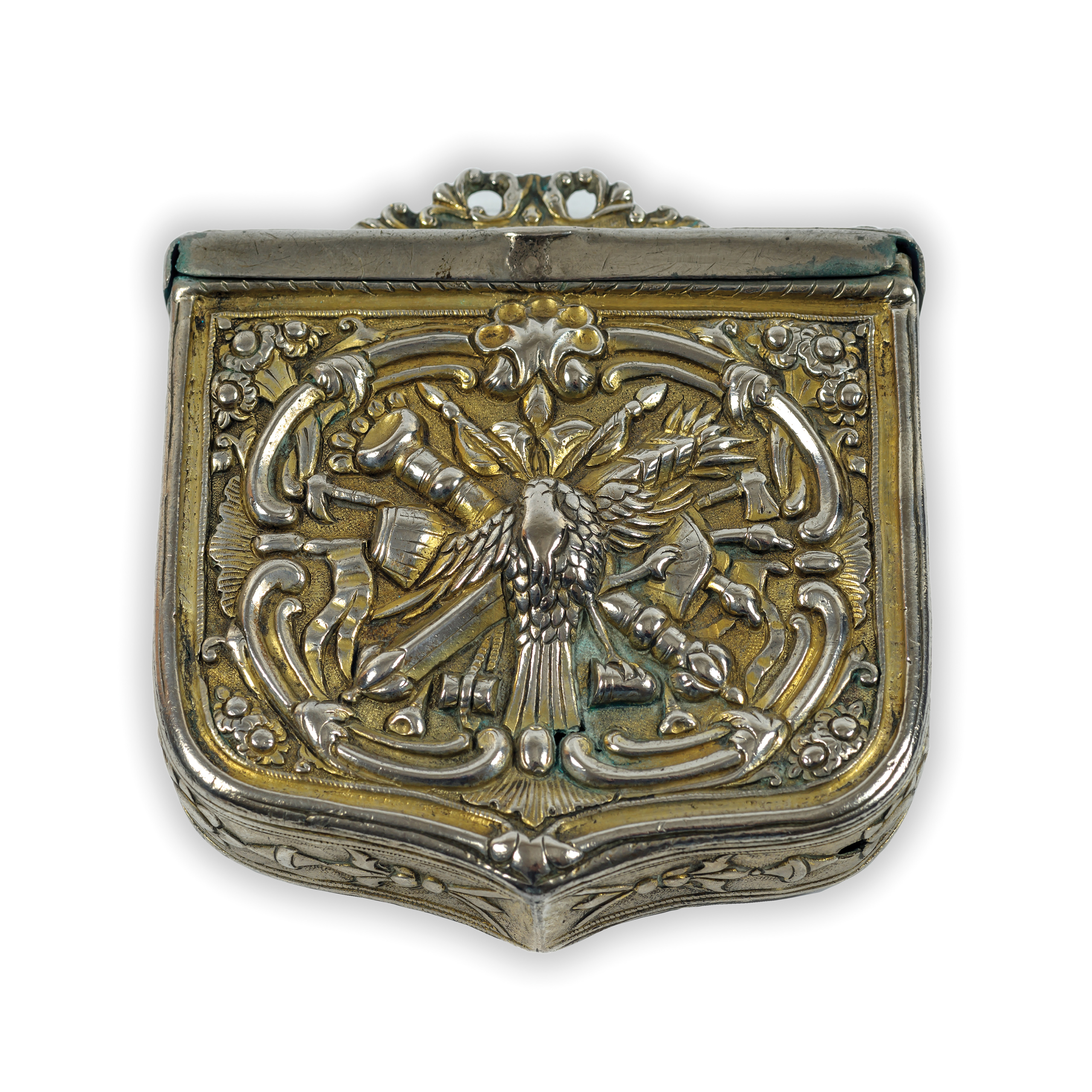 Περιγραφή: Ασημένια παλάσκα με έντονα έκτυπο και καλεμιστό διάκοσμο, μερικώς επιχρυσωμένη. Μέσα σε ελλειψοειδές περίγραμμα στην πρόσθια επιφάνεια, εραλδική σύνθεση με αετό, πολεμικά τρόπαια, λάβαρα και κέρατα Αμαλθείας. Στις γωνίες, στις πλευρές και στο κάλυμμα, που φέρει χυτή διάτρητη επίστεψη (σπασμένη στο επάνω μέρος) υπάρχει έκτυπος άνθινος διάκοσμος. Στην πίσω πλευρά, μικρή σφραγίδα (.D.9.0), που προσδιορίζει μάλλον ως ευρωπαϊκή την προέλευση του αδιακόσμητου αντικειμένου.