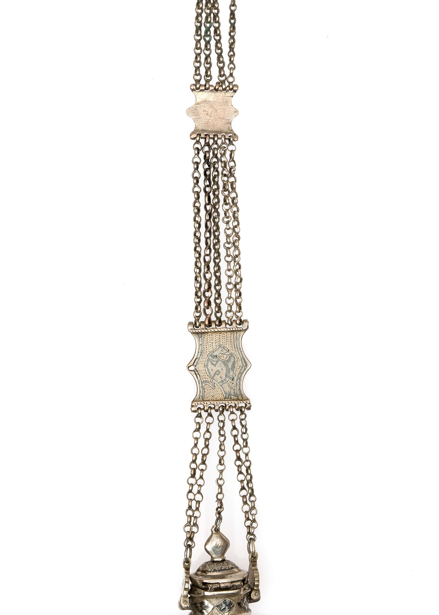 Περιγραφή: Ασημένιο ελληνικό κυλινδρικό (“βαρελάκι”) μεδουλάρι με επιπεδόγλυφη άνθινη διακόσμηση, δουλεμένη με σαβάτι (με φθορές). Τέσσερις αλυσίδες, σε τρεις ενότητες, συνδέουν τις πλαϊνές πλευρές του δοχείου, όπου οι υποδοχές, και τη χυτή ρομβοειδή απόληξη του ημισφαιρικού καλύμματος με μια πρώτη πλάκα, στην οποία εικονίζεται, από τη μία πλευρά, γυναικεία μορφή και, από την άλλη, πουλί, εν συνεχεία με μία δεύτερη μικρότερη πλάκα, με γυναικεία μορφή στη μία πλευρά και, πιο ψηλά, με μια τρίτη πλάκα, με άνθινο διάκοσμο, η οποία συνδέεται με τον γάντζο (“κόπτσα”) σχήματος δικέφαλου αετού. Ο διάκοσμος των τριών πλακών και του δικέφαλου αετού είναι επιπεδόγλυφος και σαβάτι.