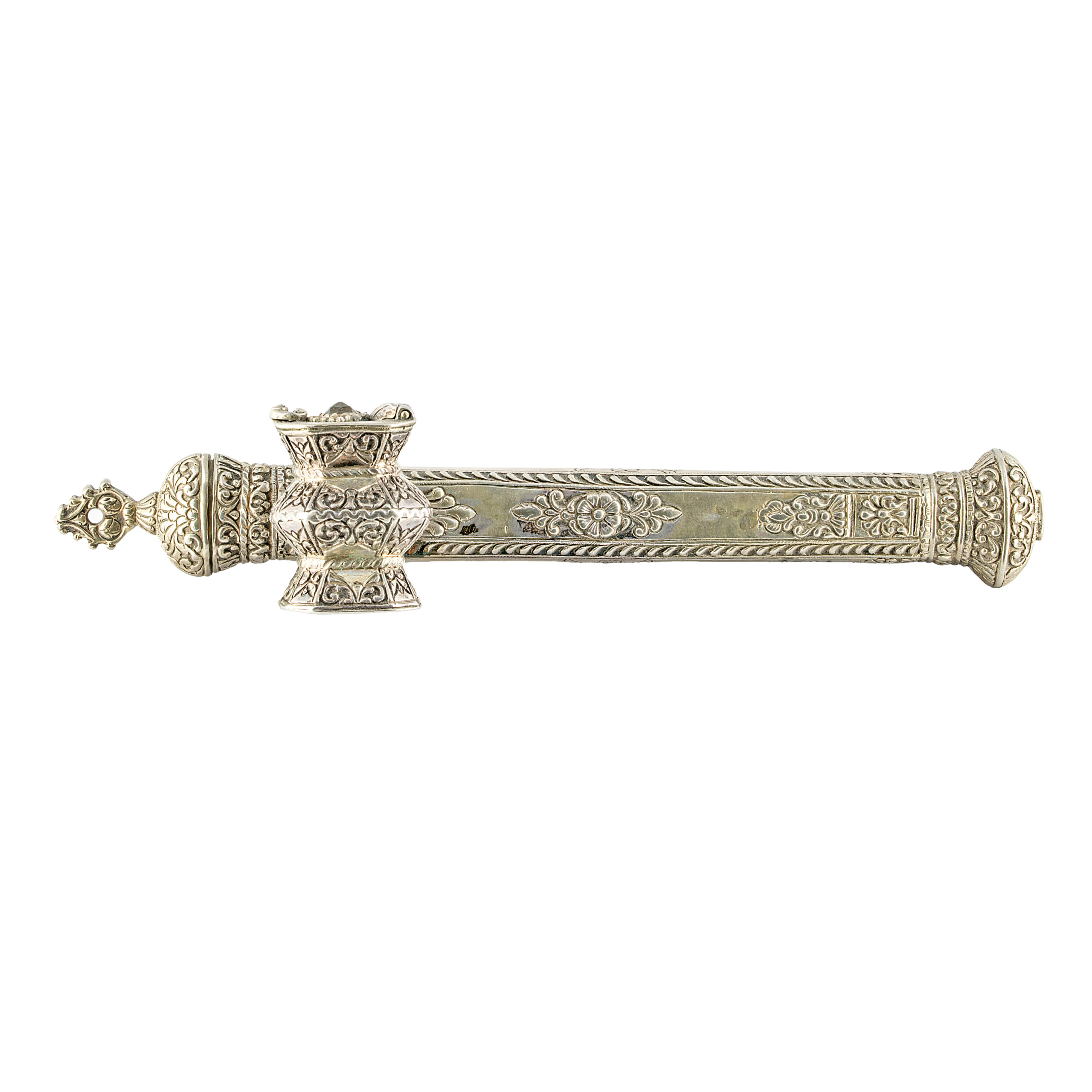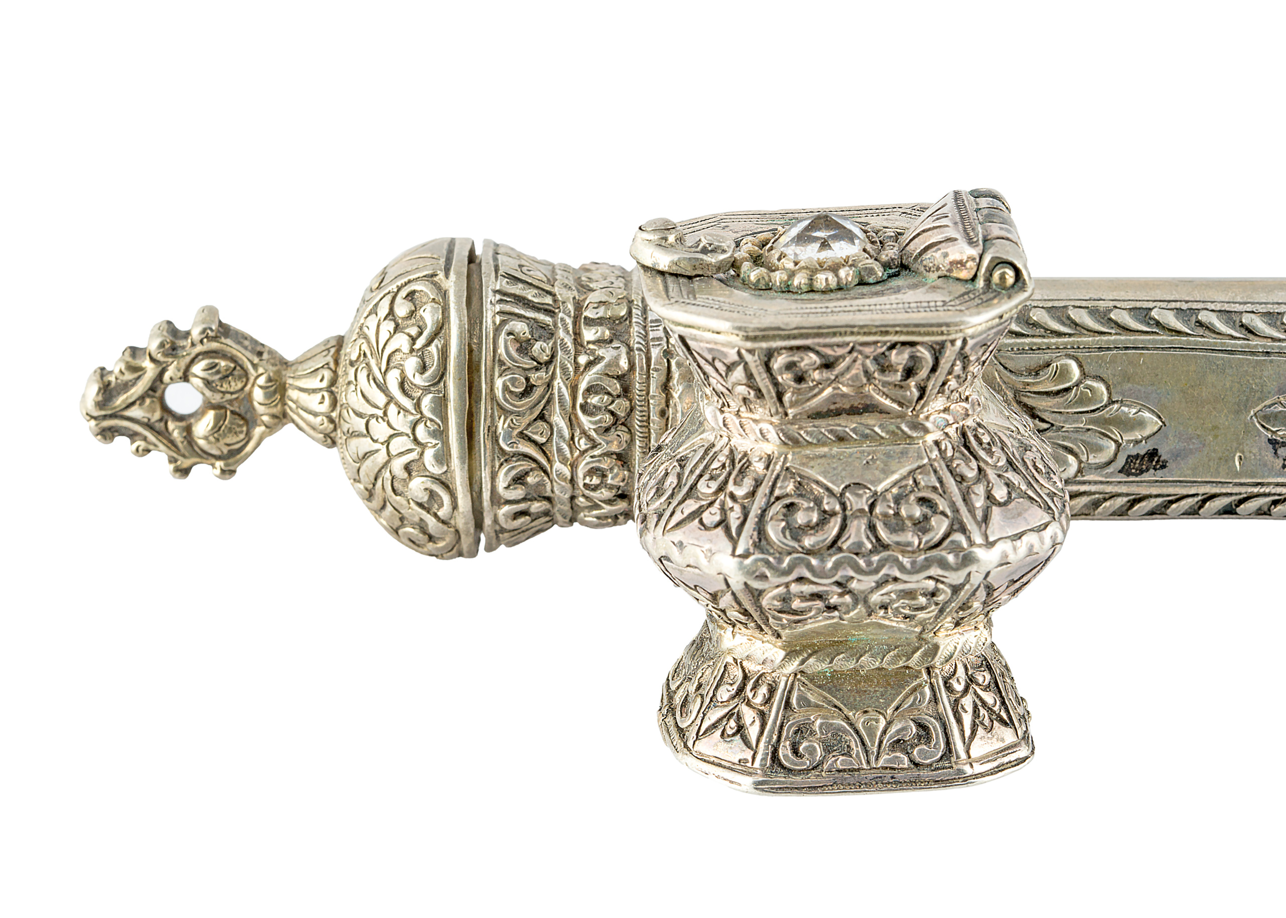 Περιγραφή: Ασημένιο καλαμάρι από την Ήπειρο, αποτελούμενο από την πεννοθήκη και το μελανοδοχείο. Στις δύο πλατιές πλευρές της πεννοθήκης, πυκνοδουλεμένο σκάλισμα καλεμιστό, με ρόδακα στο κέντρο και συνδυασμούς ανθεμίων και ροδάκων στα άκρα. Στο ένα άκρο, τρουλωτό σχήμα με ημισέληνο. Οι στενές πλευρές, με απλούστερο διάκοσμο από ανθέμια και εγχάρακτο άνθος στο κέντρο τους. Η κάτω φέρει πολύ μικρό στέλεχος με τρύπα στο μέσον (πιθανώς για κρέμασμα σε αλυσίδα ή στερέωση). Οι απολήξεις της πεννοθήκης φουσκωτές, με πυκνό καλεμιστό διάκοσμο. Η μία φέρει το πώμα (αρθρωτό) με διάτρητη χυτή επίστεψη και η άλλη, εντός τετραπλεύρου, φέρει την ένδειξη: + ΠΛΟ CΠ 1811 (που πιθανώς λειτουργούσε σαν σφραγίδα). Το μελανοδοχείο έχει σχήμα πηνίου και φέρει πυκνοδουλεμένο καλεμιστό διάκοσμο, πώμα (αρθρωτό και με ασφάλεια) με υαλόπετρα στο κέντρο, που το κόψιμό της μιμείται διαμάντι. Στο κάτω μέρος της βάσης, εγχάρακτο άνθος.