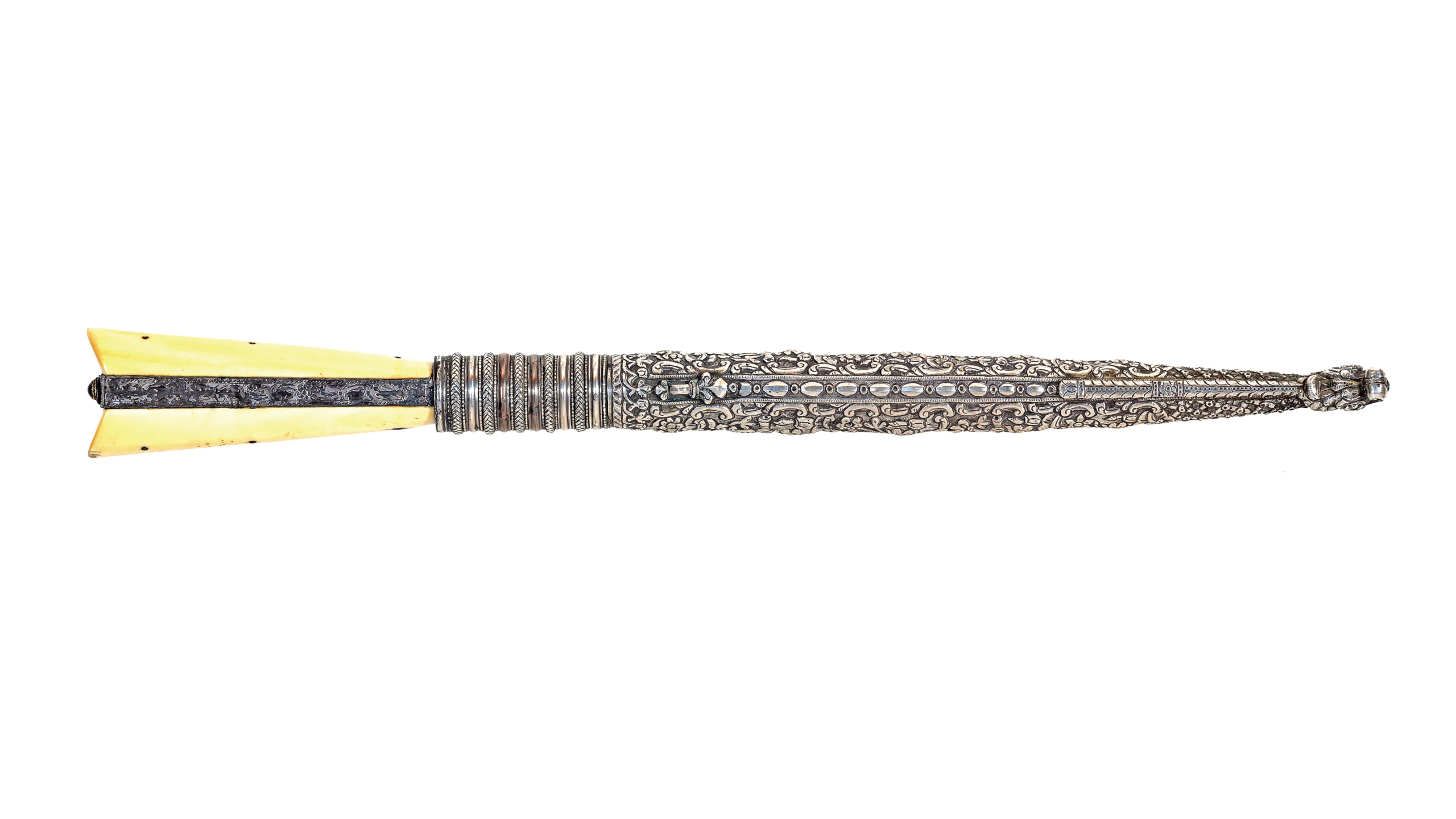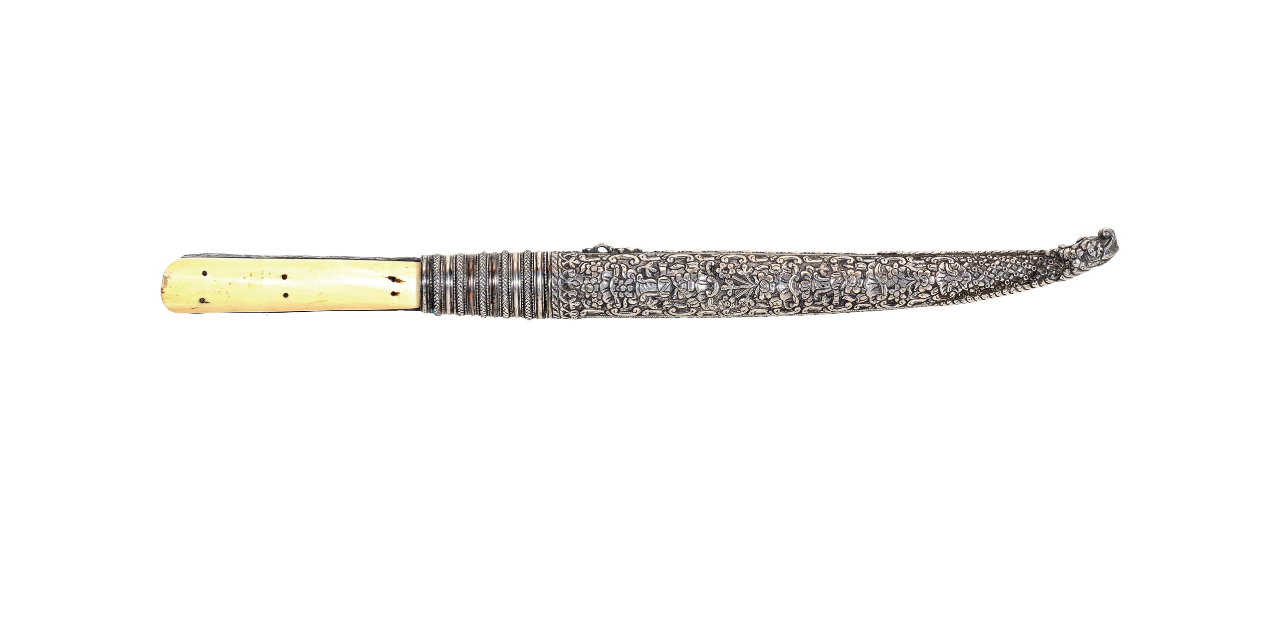 Περιγραφή: Ασημένιο κρητικό μαχαίρι με ασημένια θήκη (“φουκάρι”) και κοκκάλινη λαβή με τελείωμα σχήματος V. Η θήκη έχει πλούσιο έκτυπο και χτυπητό στην πίσσα διάκοσμο από σύνθετα ανθόμορφα και φυτικά μοτίβα. Το επάνω μέρος της, το ζέκι, αποτελείται από πέντε παράλληλες ζώνες σαν σχοινόμορφα δαχτυλίδια και το κάτω καταλήγει σε δρακοκεφαλή, που στη θέση των ματιών έχει από ένα άνθος. Η υπόλευκη κοκκάλινη λαβή αποτελείται από δύο κομμάτια που ενώνονται μεταξύ τους με ασημένια διακοσμημένη ταινία (τσεμπερλίκι) και έχει στο επάνω μέρος υποδοχή για μικρή μεταλλική λαβίδα (“μασά”), που καταλήγει σε μια μικρή γυάλινη χάντρα. Η λαβή έχει έξι (τρία ζεύγη) πείρους (περτσίνια) με τους οποίους στερεώνεται σε αυτή η λεπίδα. Η λεπίδα έχει απλή εγχάρακτη διακόσμηση.