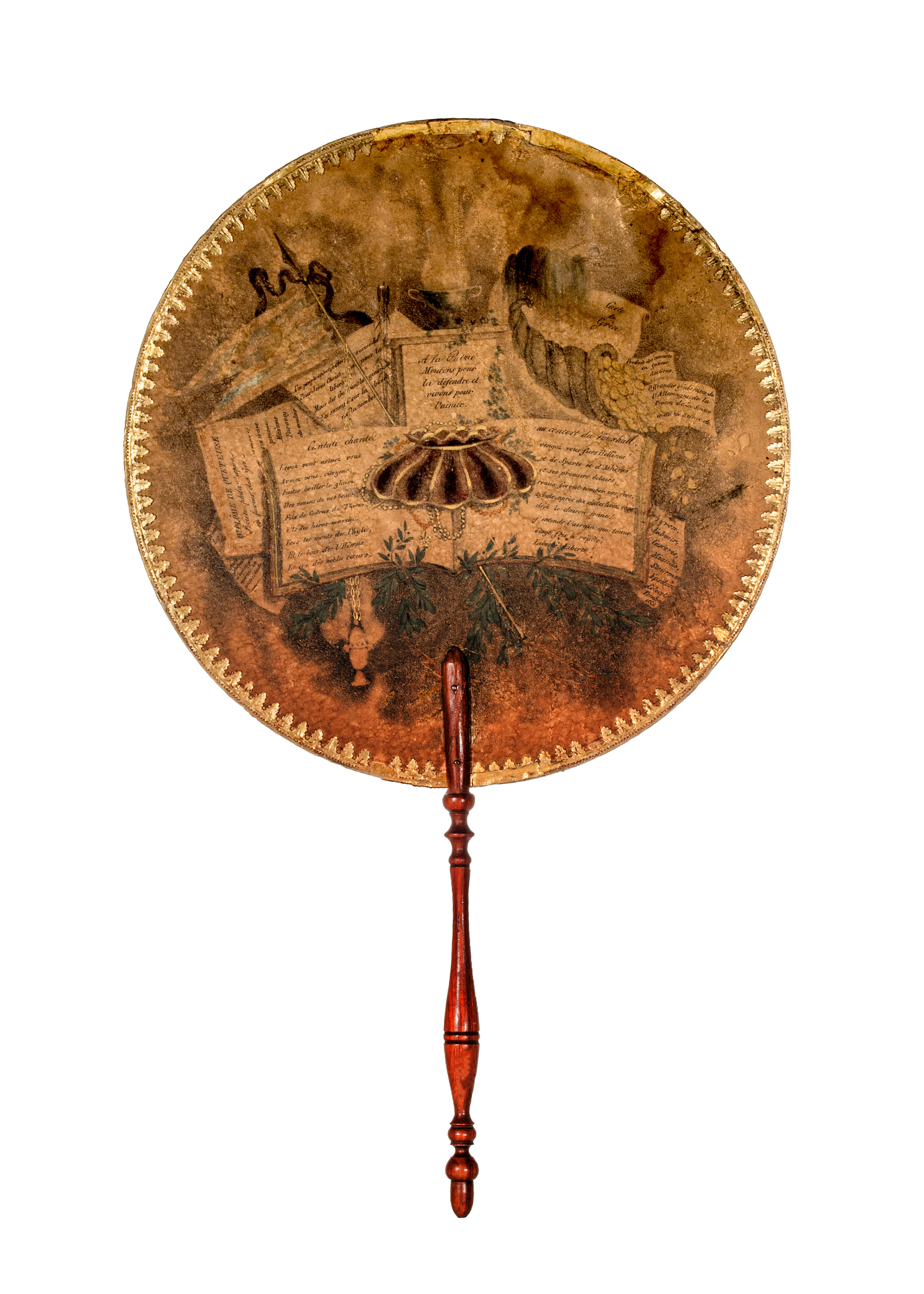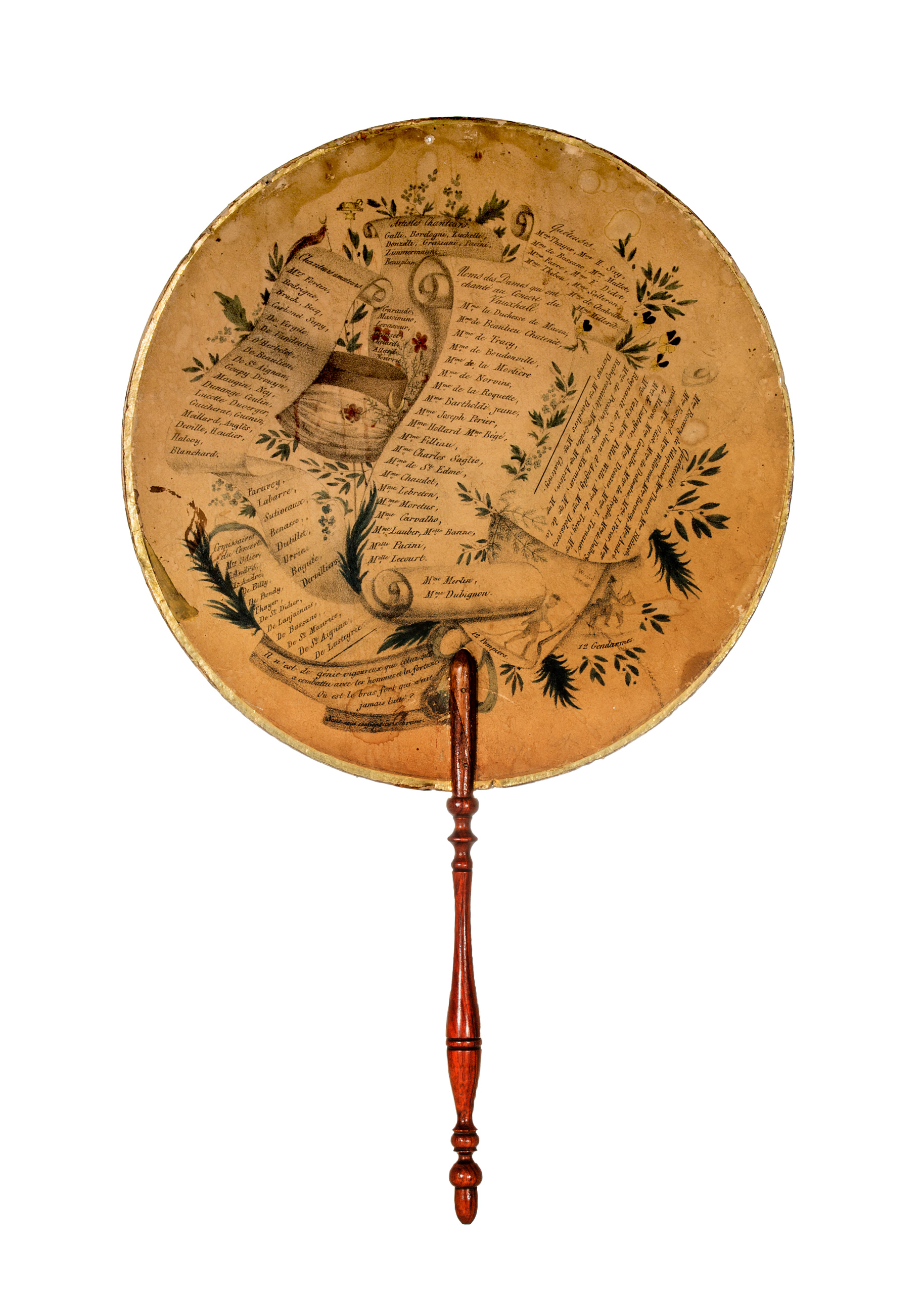 Περιγραφή: Πολύχρωμη γαλλικής κατασκευής λιθογραφημένη και επιχρωματισμένη με το χέρι χαρτονένια βεντάλια, με πολλά αναμνηστικά και ενημερωτικά στοιχεία και στις δύο όψεις, σε στρογγυλό σχήμα. Εκδόθηκε σε ανάμνηση της συναυλίας που δόθηκε στις 28 Απριλίου 1826, στο Vauxhall στο Παρίσι, όπου οι πλούσιες και όμορφες κυρίες της παρισινής αριστοκρατίας τραγούδησαν για χάρη των αγωνιζόμενων Ελλήνων. (Φθορές και λεκέδες. Συντηρημένη η περιφέρεια.)
