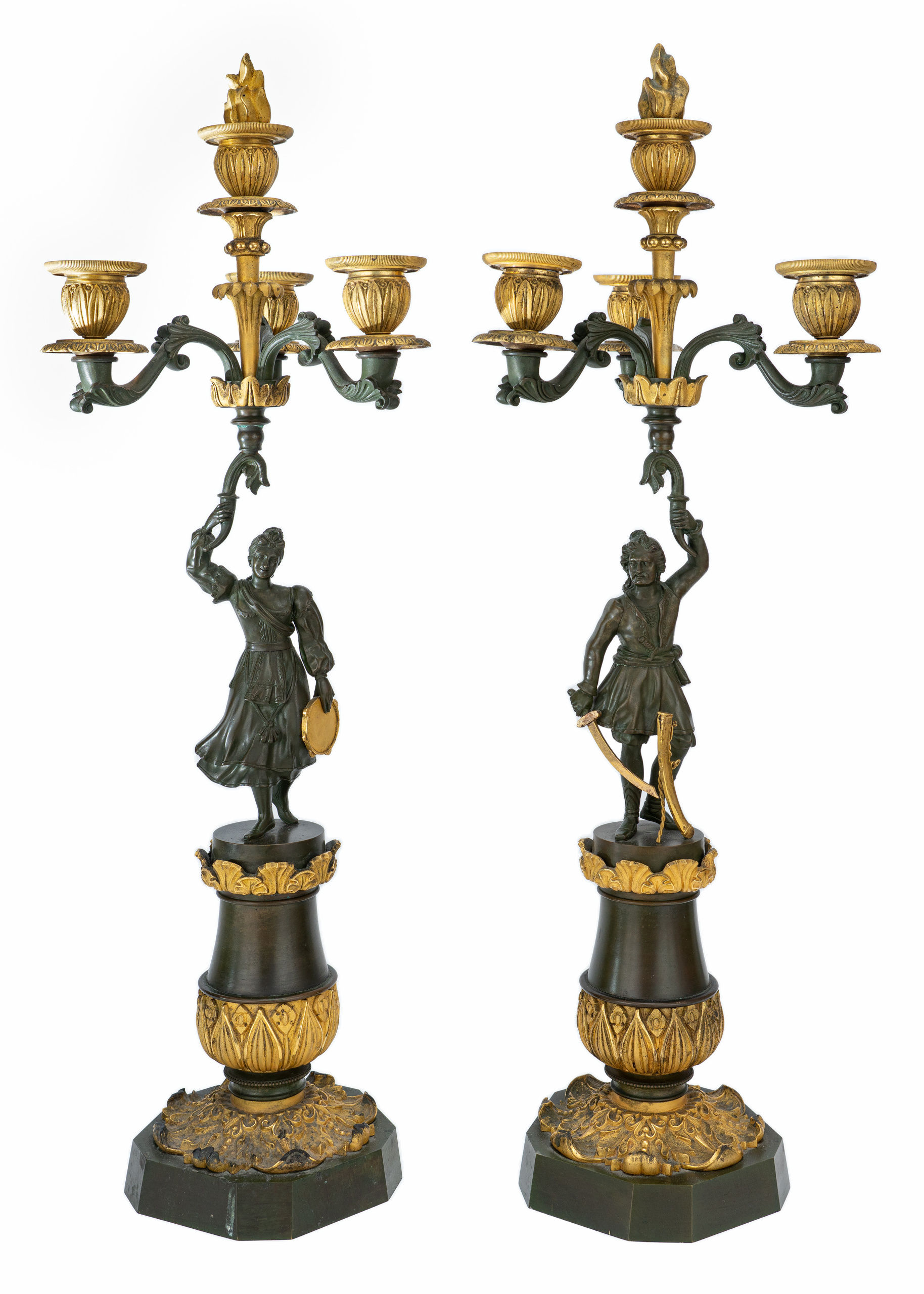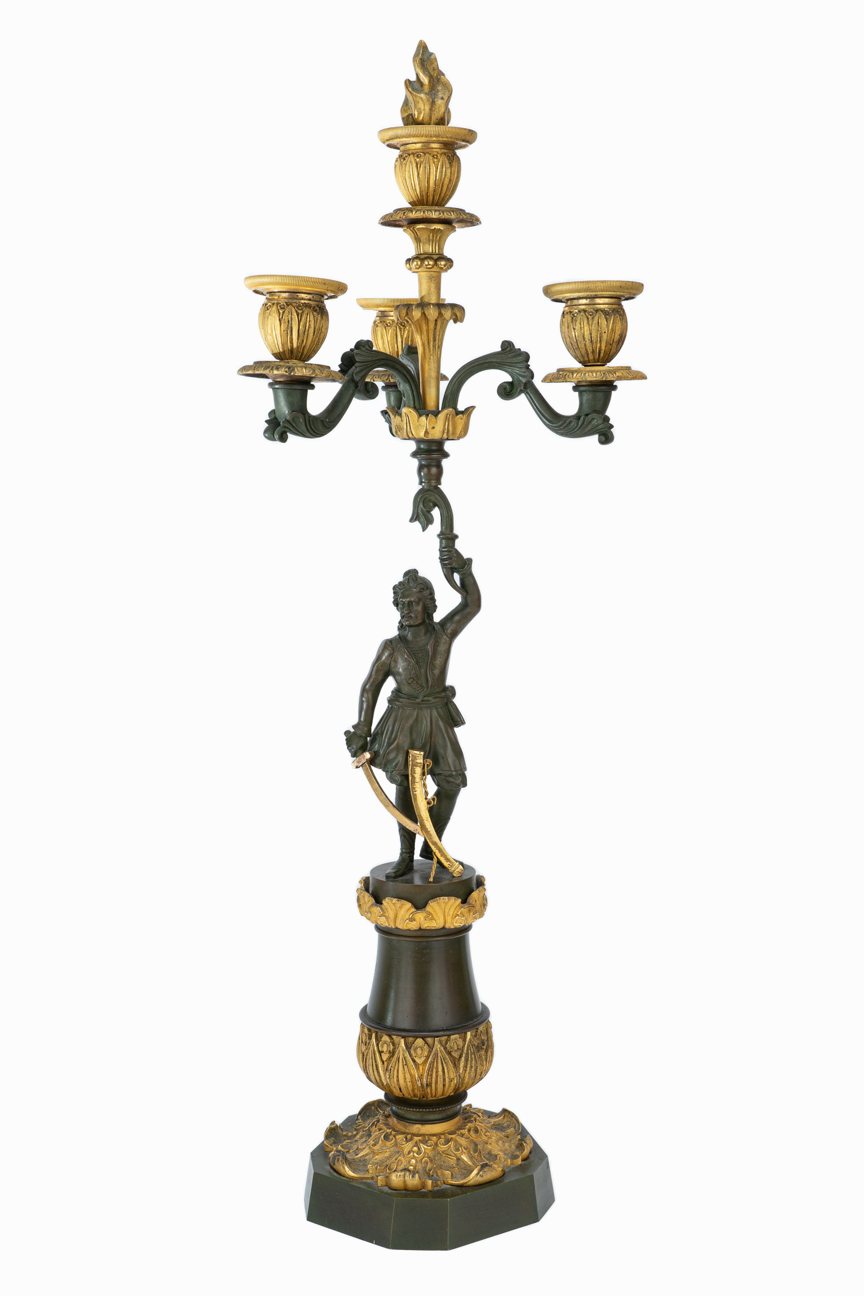 Περιγραφή: Το ένα από ζεύγος (Α+Β) γαλλικών μπρούντζινων κηροπηγίων με τέσσερις υποδοχές για κεριά και με μία πέμπτη στην κορυφή τους, που φέρει μπρούντζινη φλόγα, όλες από επιχρυσωμένο μπρούντζο. Στο Α ολόγλυφο άγαλμα από πατιναρισμένο μπρούντζο όρθιου ολόσωμου Έλληνα αγωνιστή, που κρατάει στο υψωμένο αριστερό του χέρι κέρας, από το οποίο ξεκινά το όλο σύμπλεγμα του κηροπήγιου. Στο δεξιό του χέρι κρατάει το γυμνό σπαθί του από επιχρυσωμένο μπρούντζο (πάλα), που η θήκη του (επιχρυσωμένη) είναι στερεωμένη μπροστά του. Φοράει σκούφο με κοντή φούντα, πουκάμισο, γιλέκο (φέρμελη), φουστανέλα και φέρει στο ζωνάρι του ξιφίδιο. Και τα δύο αγάλματα είναι επάνω σε μπρούντζινες πατιναρισμένες κυλινδρόμορφες βάσεις, που καταλήγουν σε πολυγωνικά πέλματα στο κάτω μέρος και φέρουν πλούσιο ένθετο επιχρυσωμένο χυτό διάκοσμο.