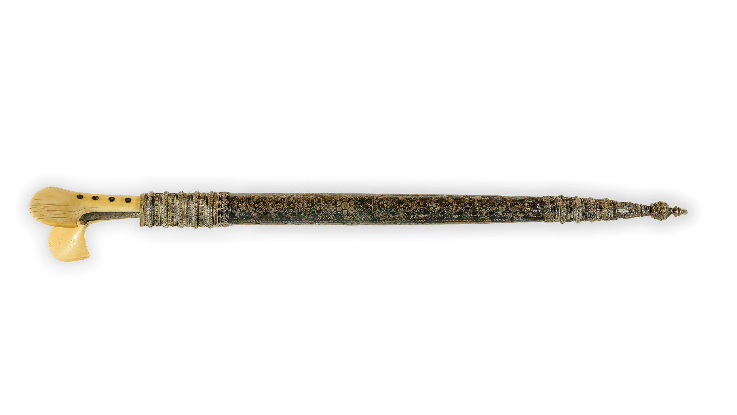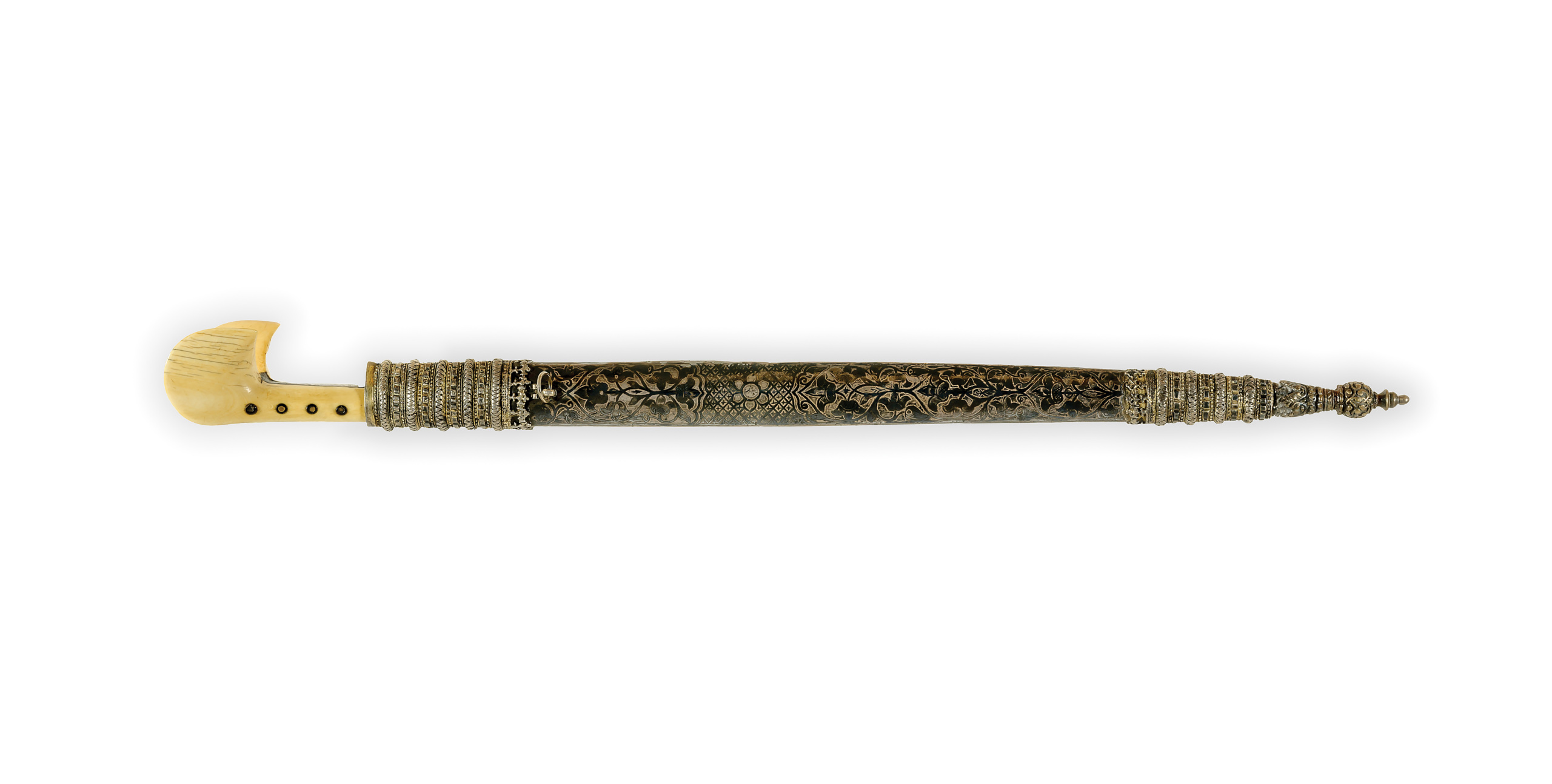 Περιγραφή: Γιαταγάνι με ασημένια θήκη και κοκκάλινη λαβή με μεγάλους λοβούς, που στερεώνεται στη λεπίδα με τέσσερις πείρους. Η πλούσια έκτυπη και σαβατλίδικη διακόσμηση παραπέμπει σε γιαννιώτικο εργαστήριο. Η θήκη, στο επάνω και στο κάτω μέρος, φέρει ανάγλυφες συμμετρικές επαναλαμβανόμενες έκτυπες παραστάσεις σε στενές ζώνες, που δημιουργούνται από πέντε και τέσσερις, αντίστοιχα, σχοινόμορφους διακοσμητικούς δακτυλίους, με τελειώματα, που παραπέμπουν σε δαντέλα. Στο κυρίως σώμα της θήκης, λεπτοδουλεμένος, πλούσιος, συμμετρικός, επαναλαμβανόμενος διάκοσμος από στυλιζαρισμένα φυτικά και άνθινα στοιχεία από σαβάτι. Η σφαιρική απόληξη της θήκης, συντηρημένη, με έξεργο φυτικό διάκοσμο. Η ατσάλινη λεπίδα από τη Δαμασκό, ευθεία, πλατιά, έχει εγχάρακτο απλό φυτικό διάκοσμο στη μια πλευρά.