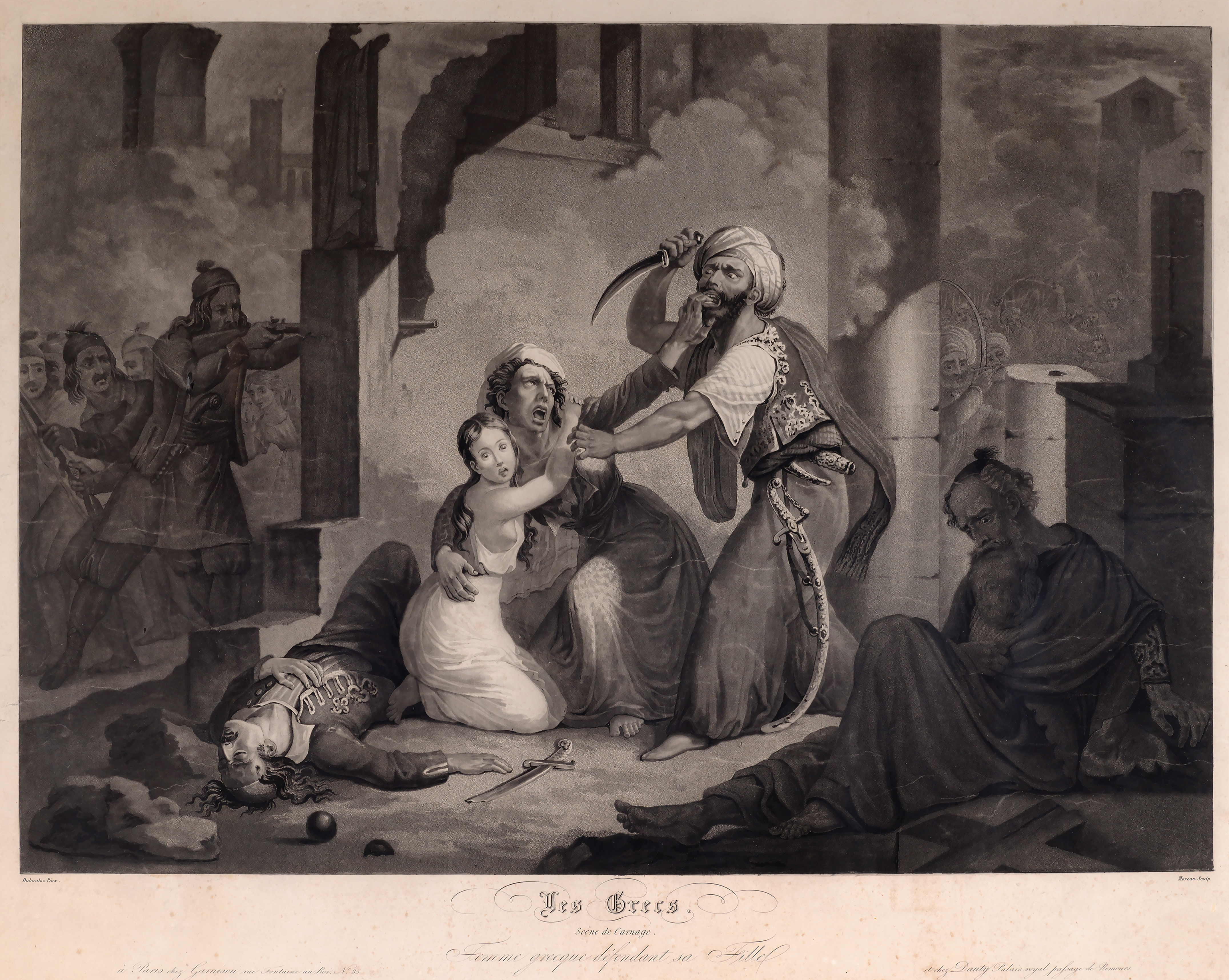 Περιγραφή: Ασπρόμαυρη χαλκογραφία – άκουα τίντα, του Α. Moreau, βασισμένη σε ζωγραφικό έργο του J. A. Dubouloz, με τίτλο: Des Grecs. Scene de Carnage. Femme grecque défendant sa Fille. (Έλληνες. Σκηνή σφαγής – μακελειού. Ελληνίδα μητέρα υπερασπιζόμενη την κόρη της). Πολυπρόσωπη σύνθεση, όπου στο κέντρο κυριαρχούν οι μορφές της μάνας να υπερασπίζεται την κόρη της, της κόρης, του νεκρού αγωνιστή πατέρα και του επιτιθέμενου τούρκου.