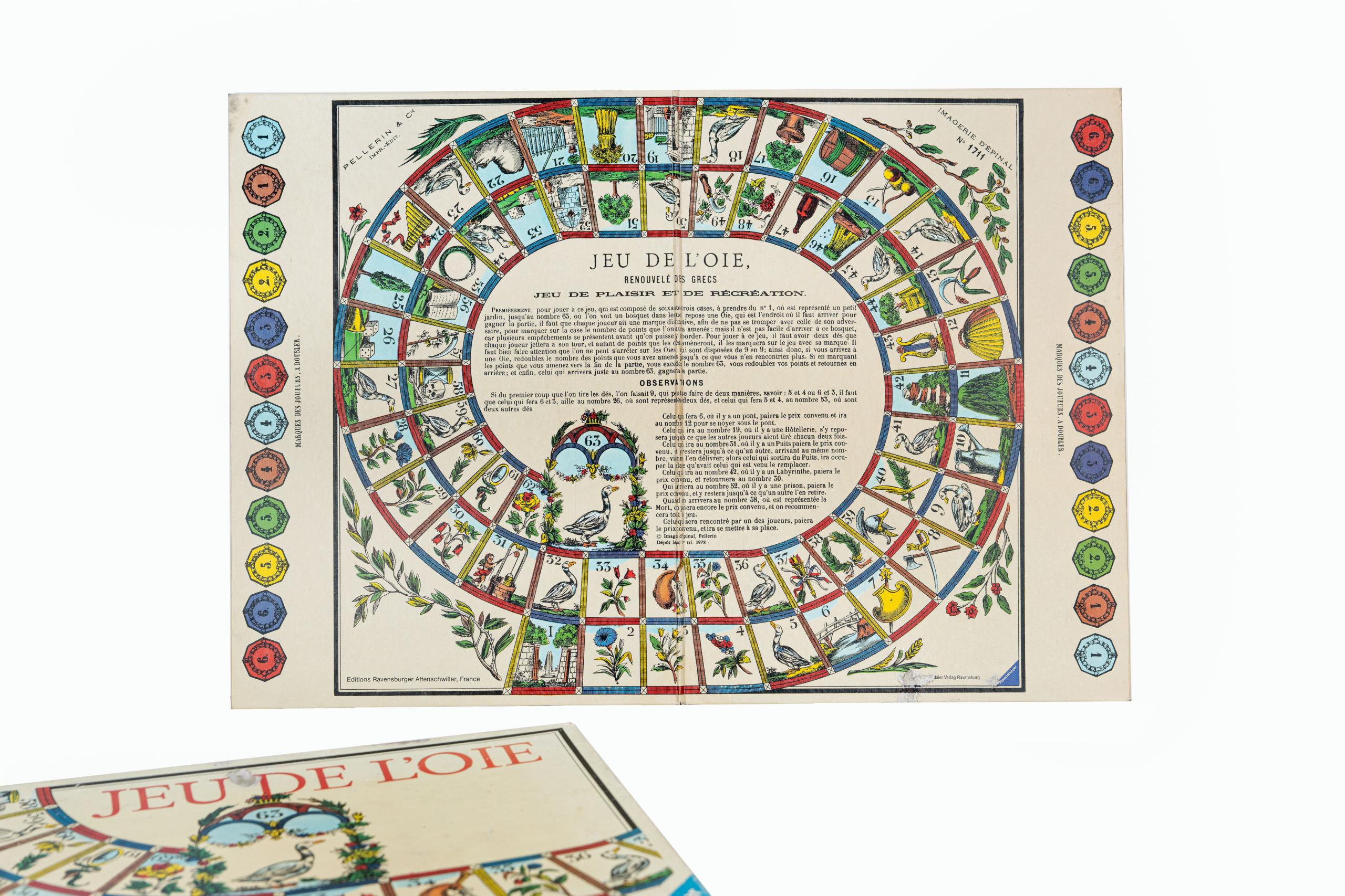 Περιγραφή: Επιτραπέζιο γαλλικό παιχνίδι “JEU DE L’OIE” (το παιχνίδι της χήνας) με την ένδειξη στη λιθογραφημένη καρτέλα: RENOUVELÉ DES GRECS (σε ελεύθερη απόδοση: προς ανανέωση, αναγέννηση των Ελλήνων ή υπενθύμιση / υπόμνηση για τους Έλληνες), με τους κανόνες του παιχνιδιού. Συνοδεύεται από την αρχική συσκευασία του (κουτί με τα ίδια στοιχεία όπως η καρτέλα). Λείπουν τα ζάρια και τα πιόνια.