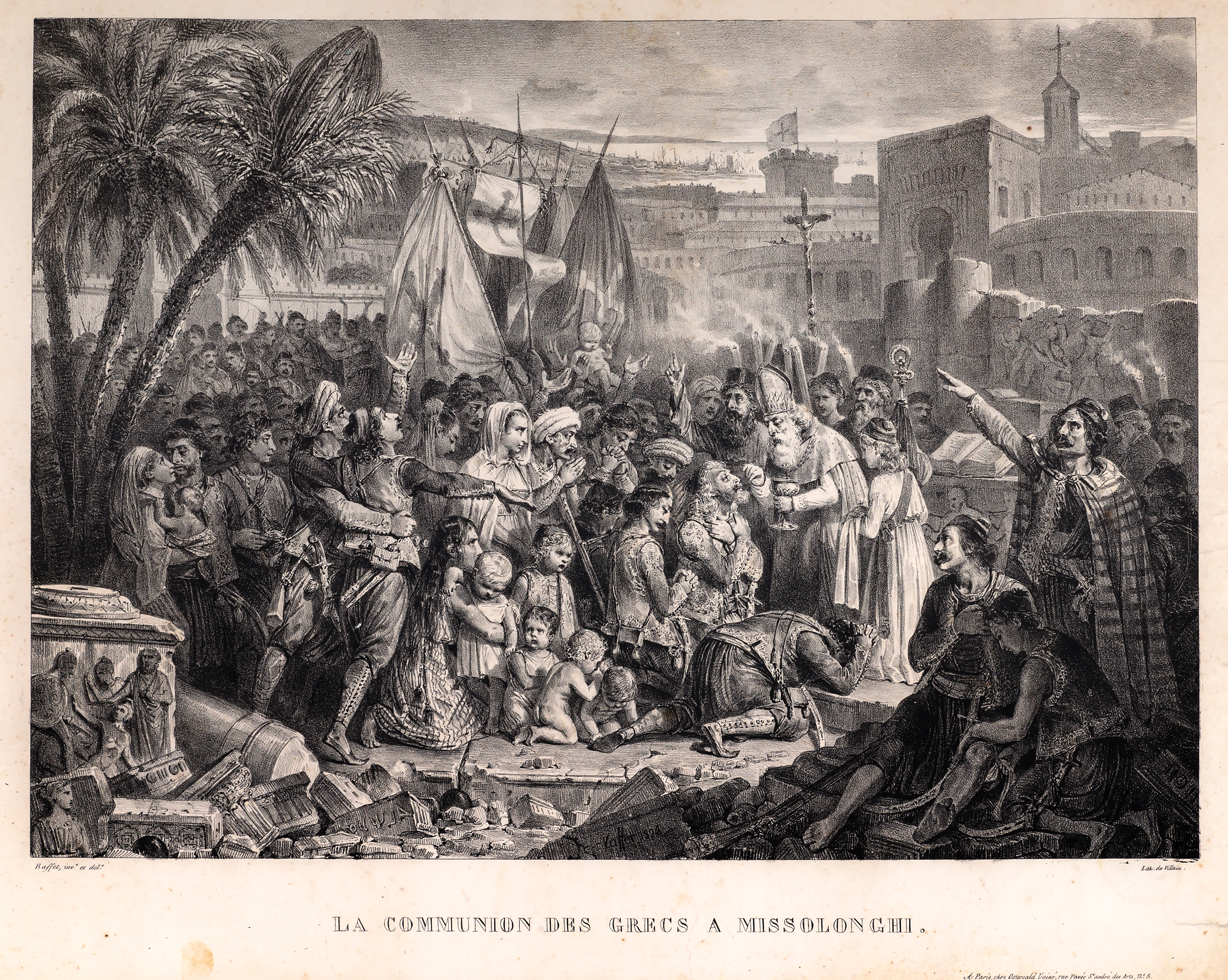 Περιγραφή: Λιθογραφία ασπρόμαυρη, γαλλικής κατασκευής, με τίτλο: LA COMMUNION DES GRECS À MISSOLONGHI. (Η (θεία) κοινωνία των Ελλήνων στο Μεσολόγγι). Στο κάτω μέρος της λιθογραφίας (στην πλάκα): Raffet 1826. Kάτω αριστερά: Raffet, inv. et del. Litho de C.Motte, R:des…… και δεξιά: Lith de Villain και πιο κάτω: À Paris chez Ostervald L΄aine rue Pavée St. Andren des Arts, no 5.