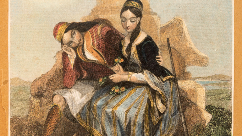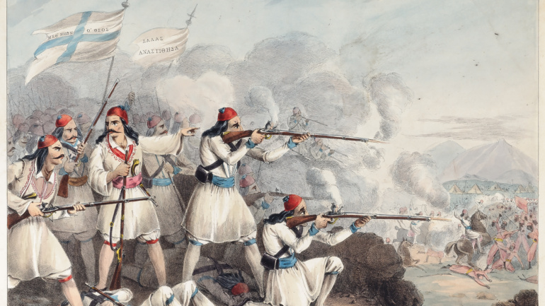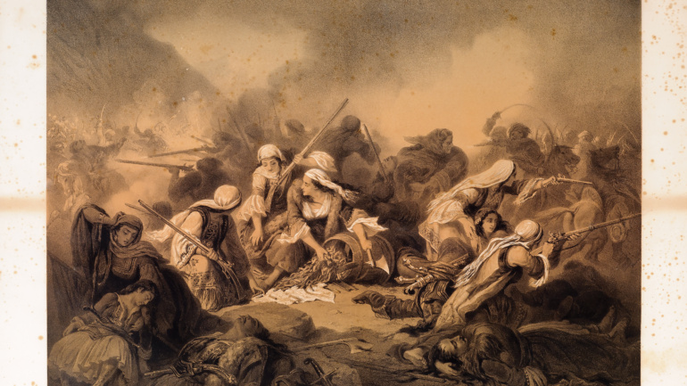 Περιγραφή: Λιθογραφία ασπρόμαυρη, γαλλικής κατασκευής, με τίτλο: LA COMMUNION DES GRECS À MISSOLONGHI. (Η (θεία) κοινωνία των Ελλήνων στο Μεσολόγγι). Στο κάτω μέρος της λιθογραφίας (στην πλάκα): Raffet 1826. Kάτω αριστερά: Raffet, inv. et del. Litho de C.Motte, R:des…… και δεξιά: Lith de Villain και πιο κάτω: À Paris chez Ostervald L΄aine rue Pavée St. Andren des Arts, no 5.