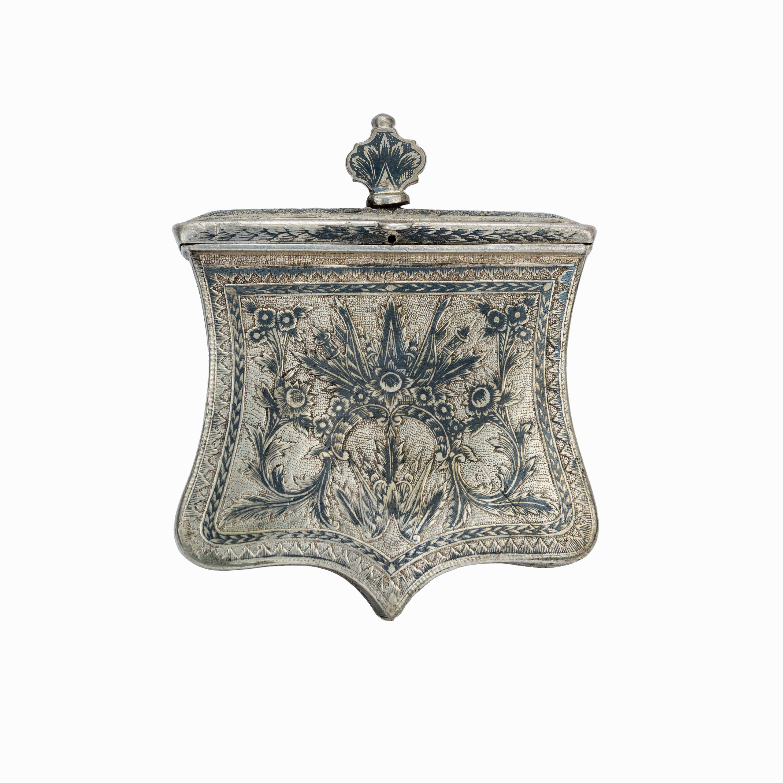 Περιγραφή: Λεπτή ασημένια ελληνική παλάσκα με εγχάρακτο καλεμιστό διάκοσμο και σαβάτι. Στην πρόσθια επιφάνεια, παράσταση με λάβαρα και πολεμικά τρόπαια σε δύο ενότητες. Στην επάνω, στο κέντρο, άνθος και, παρεμβαλλόμενα μεταξύ των τροπαίων, επιμήκη φύλλα. Η κάτω, παρόμοια σύνθεση, μέσα σε πεταλοειδές πλαίσιο, από όπου εκκινούν, δεξιά και αριστερά, φύλλα ακάνθου, που καταλήγουν σε άνθη στο επάνω μέρος. Η σύνθεση περιβάλλεται από διπλό απλά διακοσμημένο πλαίσιο, που ακολουθεί το σχήμα της παλάσκας. Στις πλευρές και το κάλυμμα, με μικρή χυτή επίστεψη με διάκοσμο από σαβάτι, επαναλαμβανόμενα διακοσμητικά στοιχεία με στυλιζαρισμένα φυλλοειδή και ρόδακες, μόνο στις πλευρές.