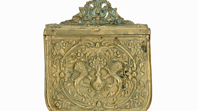 Περιγραφή: Λεπτή ασημένια ελληνική παλάσκα με εγχάρακτο καλεμιστό διάκοσμο και σαβάτι. Στην πρόσθια επιφάνεια, παράσταση με λάβαρα και πολεμικά τρόπαια σε δύο ενότητες. Στην επάνω, στο κέντρο, άνθος και, παρεμβαλλόμενα μεταξύ των τροπαίων, επιμήκη φύλλα. Η κάτω, παρόμοια σύνθεση, μέσα σε πεταλοειδές πλαίσιο, από όπου εκκινούν, δεξιά και αριστερά, φύλλα ακάνθου, που καταλήγουν σε άνθη στο επάνω μέρος. Η σύνθεση περιβάλλεται από διπλό απλά διακοσμημένο πλαίσιο, που ακολουθεί το σχήμα της παλάσκας. Στις πλευρές και το κάλυμμα, με μικρή χυτή επίστεψη με διάκοσμο από σαβάτι, επαναλαμβανόμενα διακοσμητικά στοιχεία με στυλιζαρισμένα φυλλοειδή και ρόδακες, μόνο στις πλευρές.