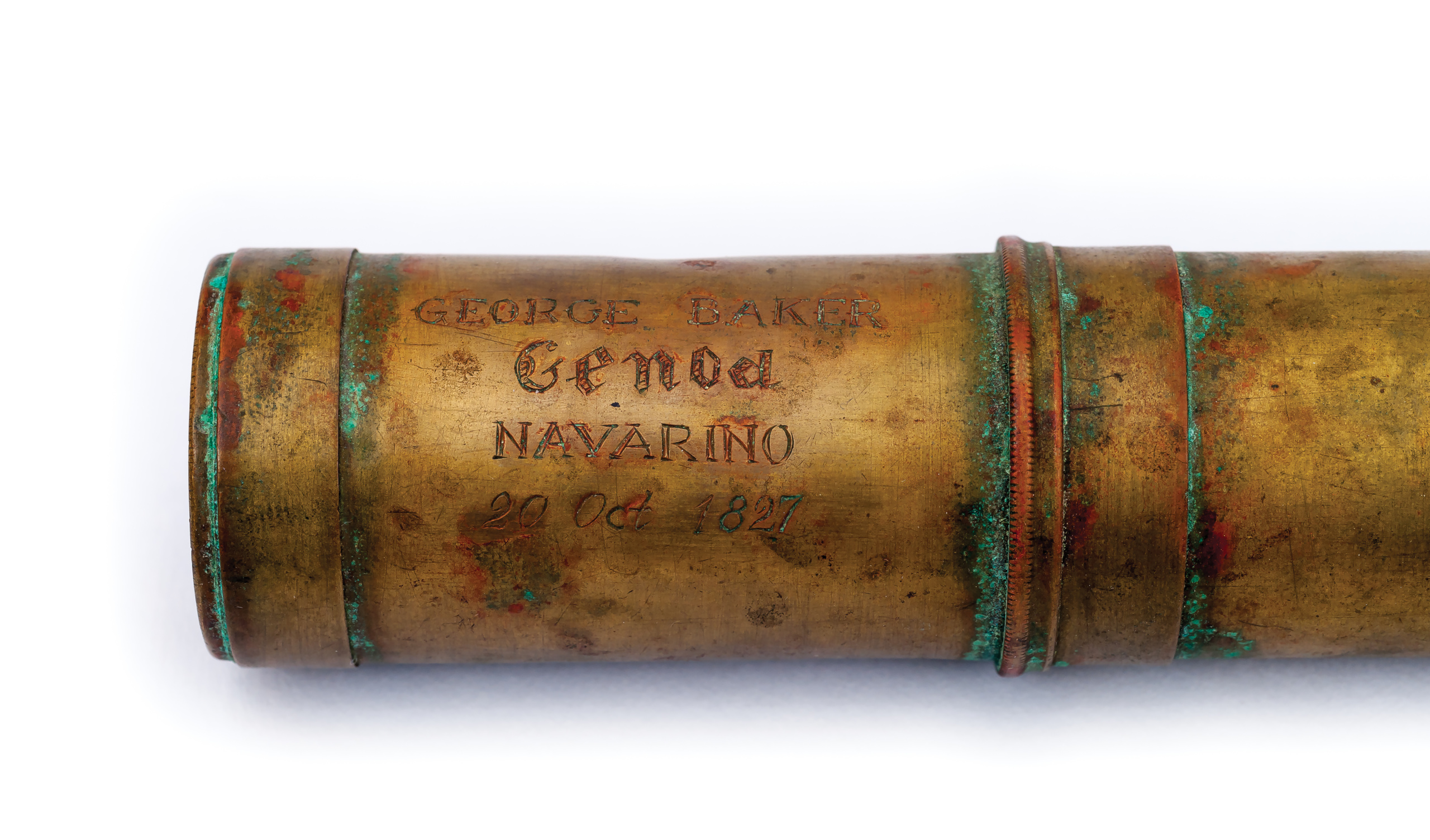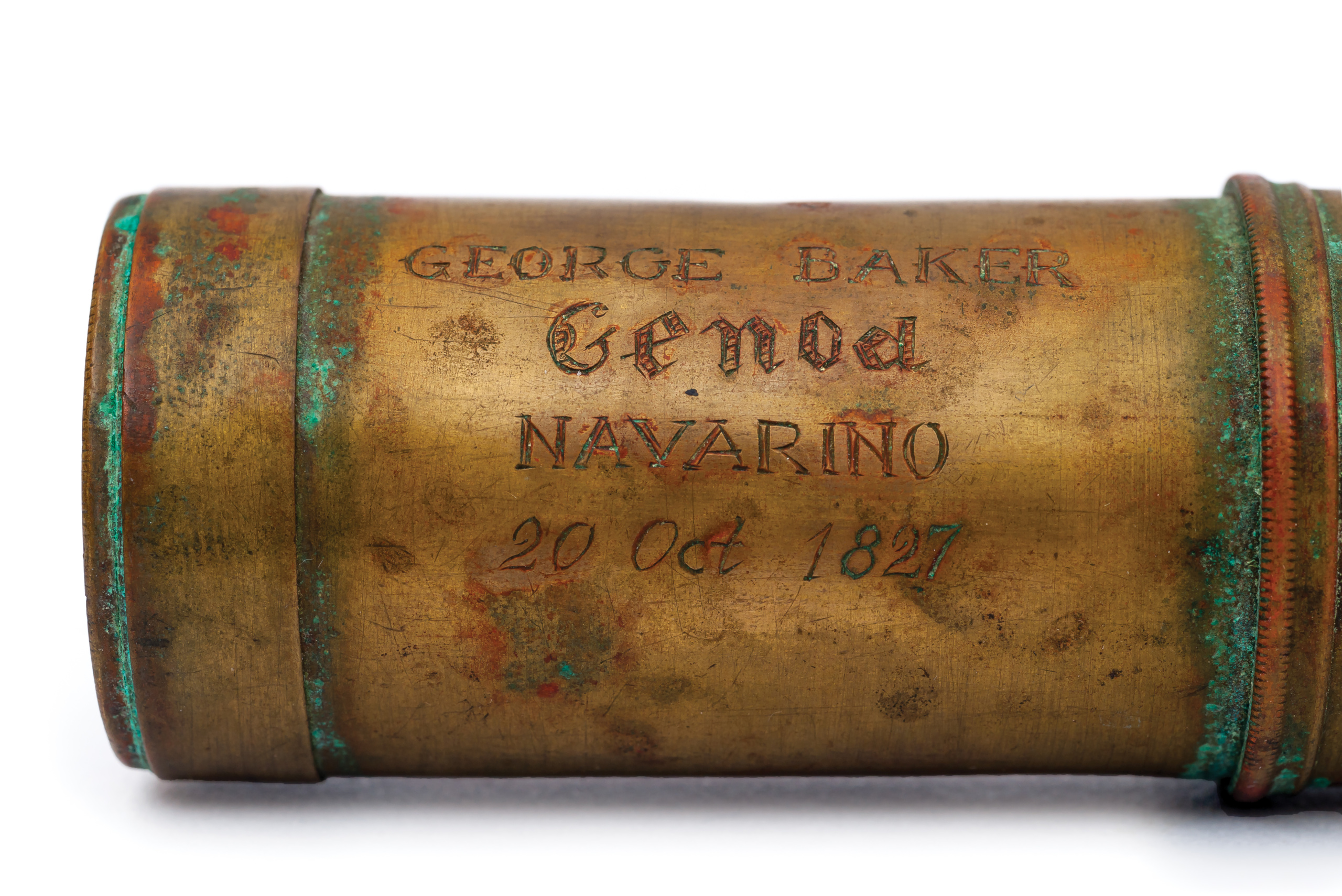 Περιγραφή: Μονοκιάλι μπρούντζινο, με χαραγμένη την ένδειξη στο μπροστινό τύμπανο: GEORGE BAKER Genoa NAVARINO 20 Oct 1827. Είναι πτυσσόμενο, αποτελείται από τέσσερα μέρη και στο πίσω μέρος (προσοφθάλμιο) έχει καλύπτρα. (Λείπει ο προσοφθάλμιος φακός. Έχει οξειδώσεις σε διάφορα σημεία του μπροστινού τυμπάνου και του προσοφθάλμιου τμήματος.)