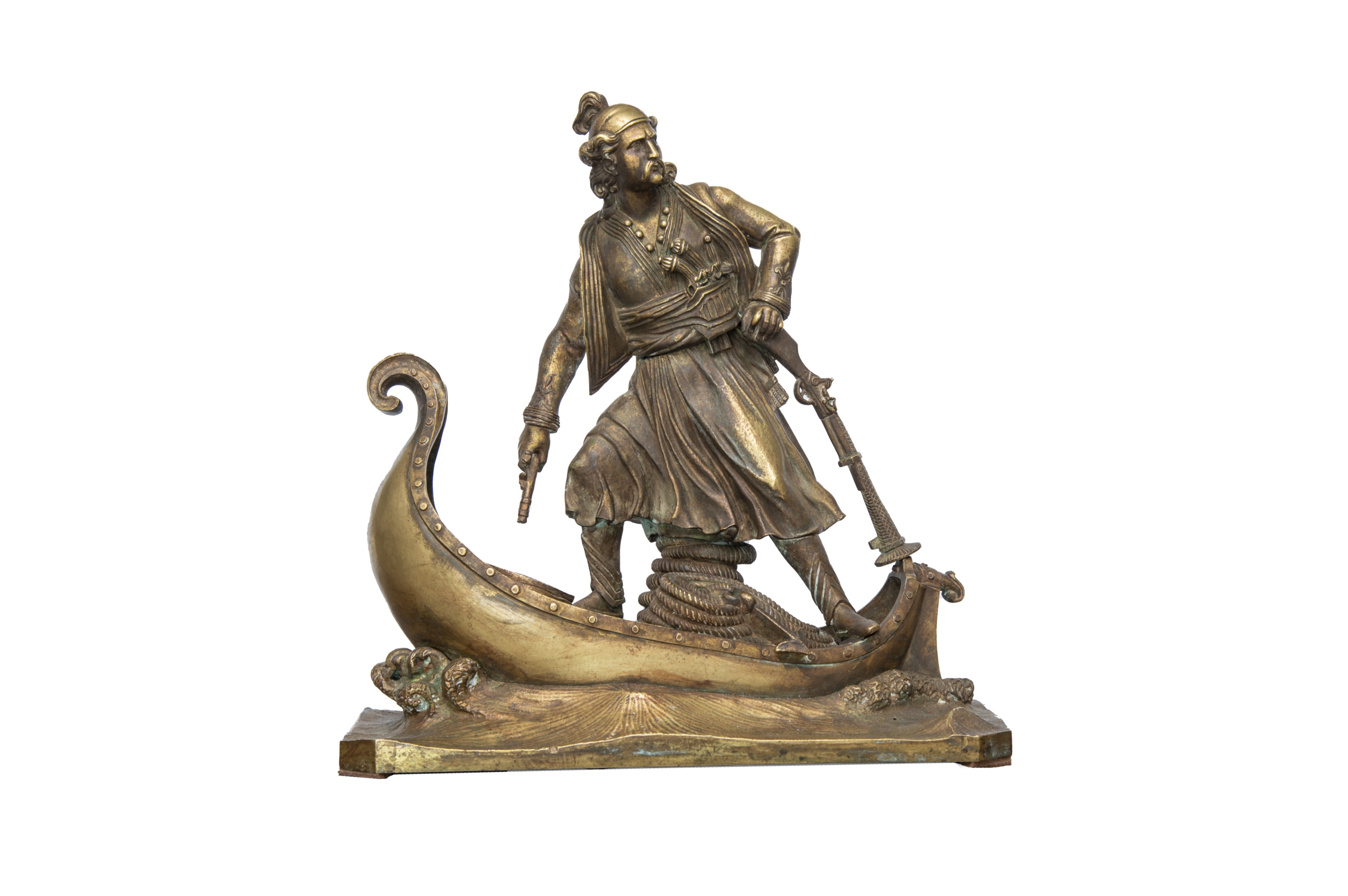 Περιγραφή: Αγαλματίδιο μπρούντζινο, χωρίς ένδειξη του καλλιτέχνη, με θέμα τον Ανδρέα Μιαούλη (ή τον Κανάρη ή Έλληνα ναύτη της Επανάστασης). Η σύνθεση αποτελείται από τον Μιαούλη, όρθιο επάνω σε βάρκα, να κρατάει με το αριστερό χέρι, ανάποδα, ένα τρομπόνι στη θέση της λαγουδέρας και με το δεξί πιστόλα επάνω από το σκέπασμα ενός βαρελιού (με πυρίτιδα;). Είναι γερμένος προς τα δεξιά του, κατά την κλίση της βάρκας και ακουμπά τη μέση του σε κοντό άλμπουρο. Πάνω στη βάρκα, σχοινιά και δεμένη άγκυρα.