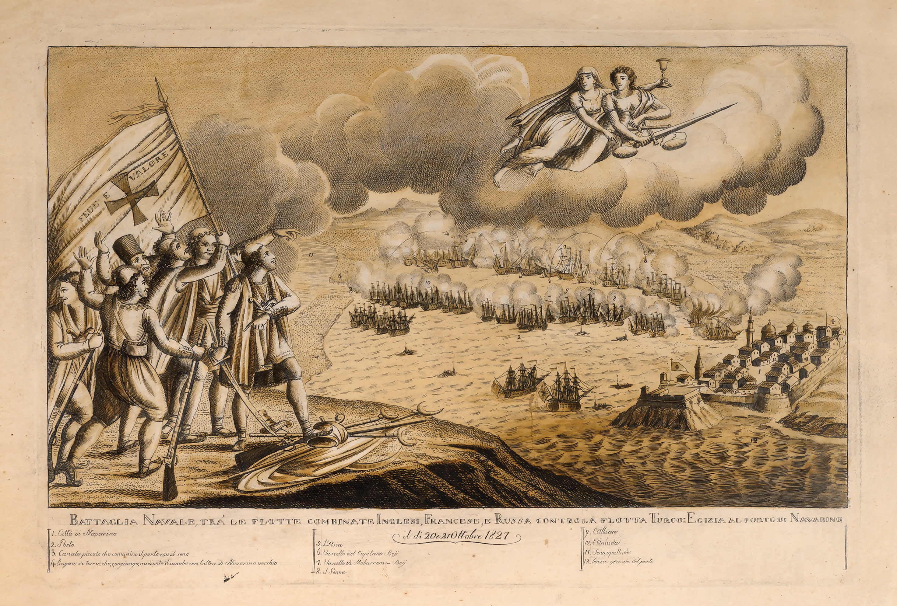 Περιγραφή: Χαλκογραφία επιζωγραφισμένη με τίτλο: BATAGLIA NAVALE TRA LES FLOTTE COMBINATE INGLESI, FRANCESE, ET RUSSA CONTRO LA FLOTTA TURCO-EGIZIA AL PORTO DI NAVARINO il di 20 e 21 ottombre 1827. (Ναυμαχία των τριών ενωμένων στόλων, αγγλικού, γαλλικού και ρωσικού, εναντίον του τουρκο-αιγυπτιακού στόλου, στο λιμάνι του Ναβαρίνου, στις 20 και 21 Οκτωβρίου 1827).