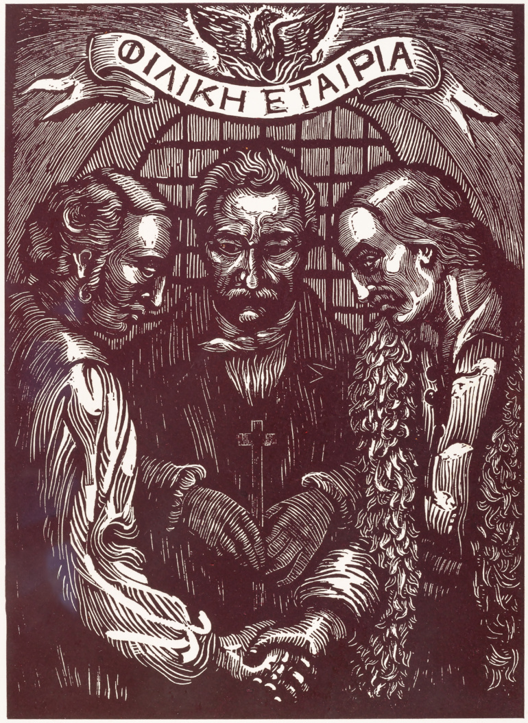 C0664Κατηγορία: ΝΕΟΕΛΛΗΝΙΚΑ ΧΑΡΑΚΤΙΚΑ - ΠΡΟΕΠΑΝΑΣΤΑΤΙΚΗ ΠΕΡΙΟΔΟΣΚωδικός: C0664Υλικό: ΧΑΡΤΙΧρονολογία κατασκευής: 1970Διαστάσεις: 41,5x31,5 εκ.Περιγραφή: Ξυλογραφία σε όρθιο ξύλο του Βάσσου Φαληρέα, όπου απεικονίζονται οι τρεις ιδρυτές της Φιλικής Εταιρίας Ν. Σκουφάς, Εμ. Ξάνθος και Αθ. Τσακάλωφ. Πάνω, η επιγραφή: ΦΙΛΙΚΗ…