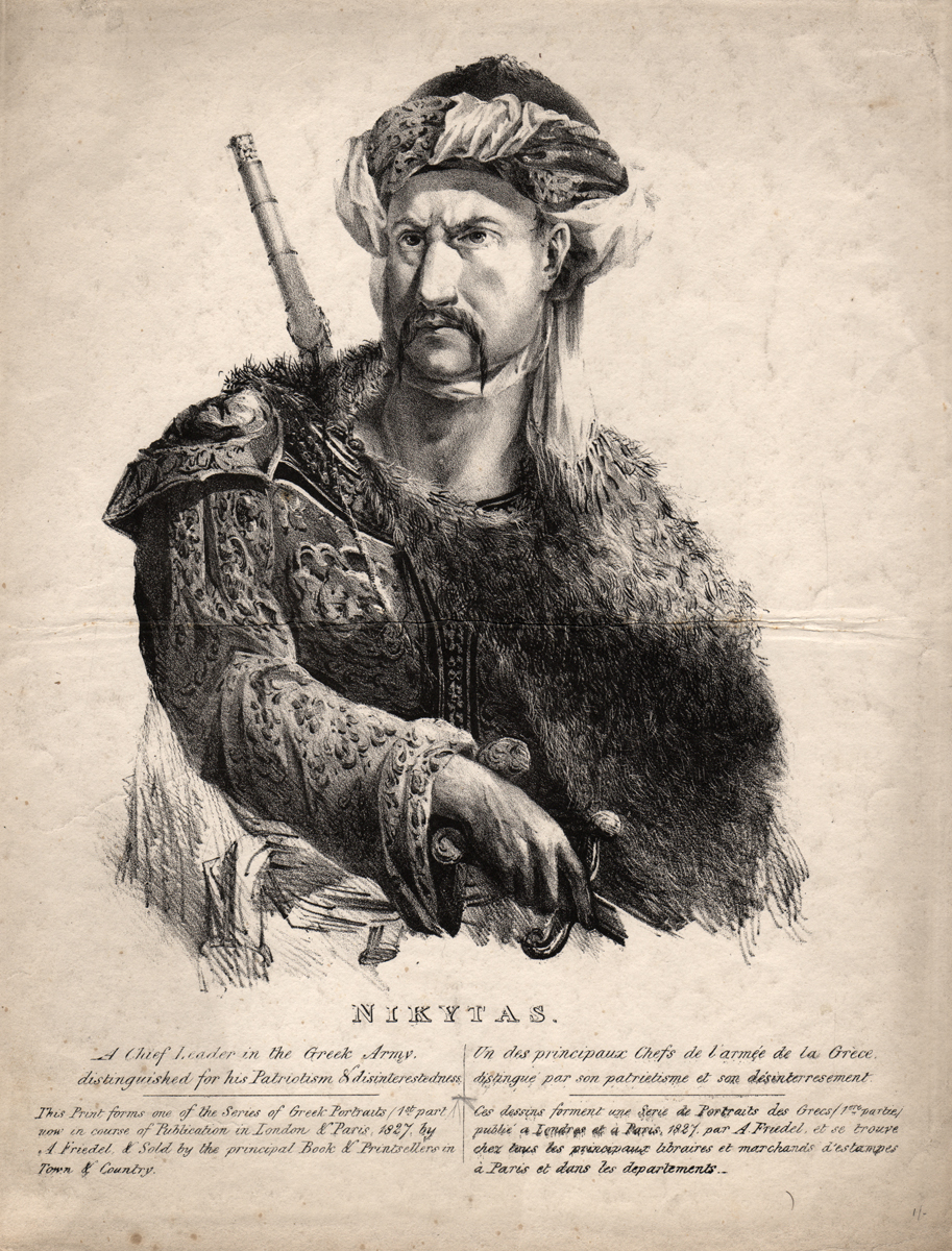 Περιγραφή: Λιθογραφία ασπρόμαυρη, με τίτλο: NIKYTAS. Είναι έργο του A. Friedel, με τον Νικηταρά (Νικήτα Σταματελόπουλο) σε προτομή (μπούστο). Από κάτω, κείμενο σε δύο στήλες (αγγλικά και γαλλικά): A Chief Leader in the Greek Army, distinguished for his patriotism & disinterestedness. (Ένας καπετάνιος στον Ελληνικό Στρατό, διακριθείς για τον πατριωτισμό και την ανιδιοτέλειά του). Από κάτω: This Print forms one of the Series of Greek Portraits (1st part) now in course of Pubication in Lodon & Paris, 1827, by A. Friedel & sold by the principal Book & Printsellers in Town & Country.