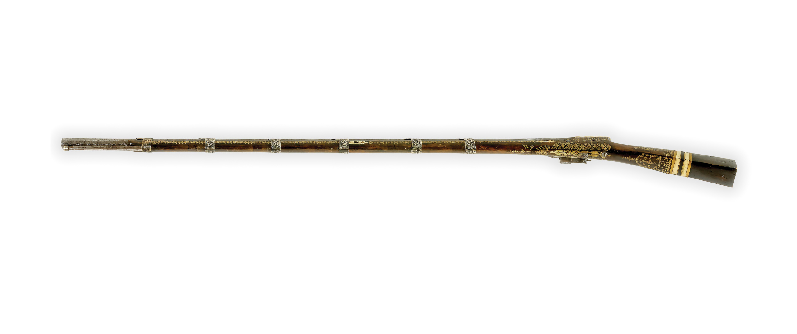 Περιγραφή: Οθωμανικός σισανές, λάφυρο Ελλήνων αγωνιστών στο Μεσολόγγι, σύμφωνα με προφορική πληροφορία. Η ατσάλινη κάννη, οκταγωνικού σχήματος, είναι κατασκευασμένη από ατσάλι από τη Δαμασκό και φέρει εσωτερικά ευθύγραμμες ραβδώσεις. Κατά μήκος των δύο πλευρών, στο κάτω μέρος και στο πενταγωνικό κοντάκι του όπλου, υπάρχουν πυκνά καλοδουλεμένα διακοσμητικά στοιχεία ανατολίτικης αισθητικής, από ένθετο μπρούντζο. Κυριαρχούν ρόδακες, που σχηματίζονται από μικροσκοπικά μπρούντζινα κομμάτια συμμετρικά τοποθετημένα και είτε αποτελούν αυθύπαρκτα επαναλαμβανόμενα διακοσμητικά στοιχεία, είτε, συνδυαζόμενοι μεταξύ τους, συνθέτουν ποικίλα κυκλικά, ρομβοειδή ή πολυπλοκότερα διακοσμητικά σχήματα. Στο κοντάκι, στο επάνω μέρος του όπλου στο ύψος του μηχανισμού, στη σκανδάλη και στα τέσσερα σημεία ανάρτησης του όπλου υπάρχουν ένθετα πλακίδια από λευκό κόκκαλο ή κέρατο. Ο πυροδοτικός με πυρόλιθο μηχανισμός, βαλκανικού τύπου, έχει εγχάρακτα φυτικά σχέδια. Δεν υπάρχει φυλακτήρας της σκανδάλης, όπως σε όλους τους σισανέδες. Η κάννη “δένεται” με το υπόλοιπο όπλο με έξι ασημένιους συνδετήρες (ψέλια) διακοσμημένους με φυτικά μοτίβα. Στο κάτω μέρος, η μεταλλική τουφεκόβεργα.