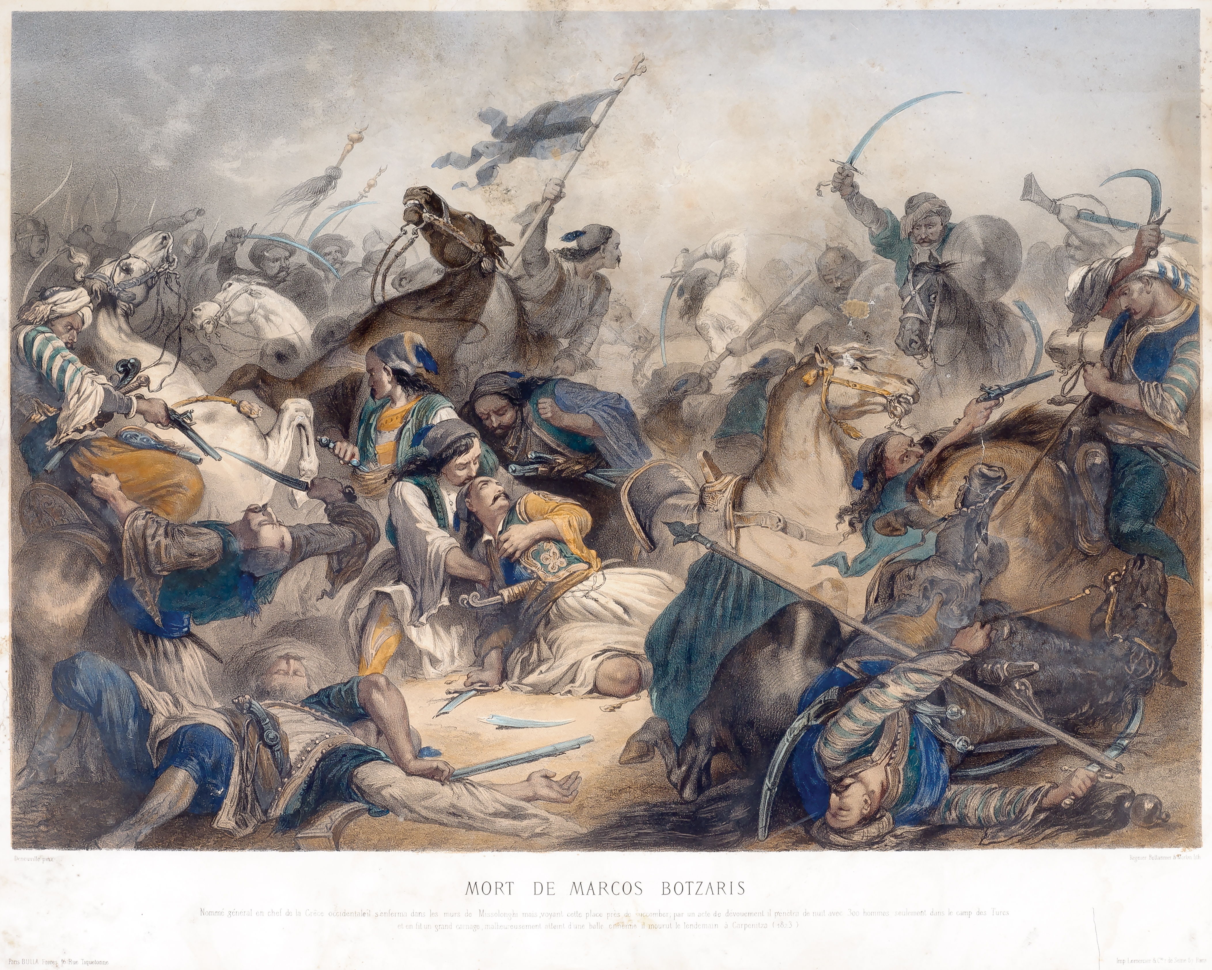 Περιγραφή: Χρωμολιθογραφία φιλελληνικού περιεχομένου, με τίτλο: MORT DE MARCOS BOTZARIS (Ο θάνατος του Μάρκου Μπότσαρη). Κάτω από τον τίτλο υπομνηματισμός, με στοιχεία για τον Μ. Μπότσαρη. Παρέχονται οι εξής πληροφορίες για το χαρακτικό: Deneuville pinx, Paris Bulla Fréres 16 Rue Tiquetonne, Regnier Bettannie & Morlon lith. και Imp. Lemercier & Cie r. de Seine 57 Paris.