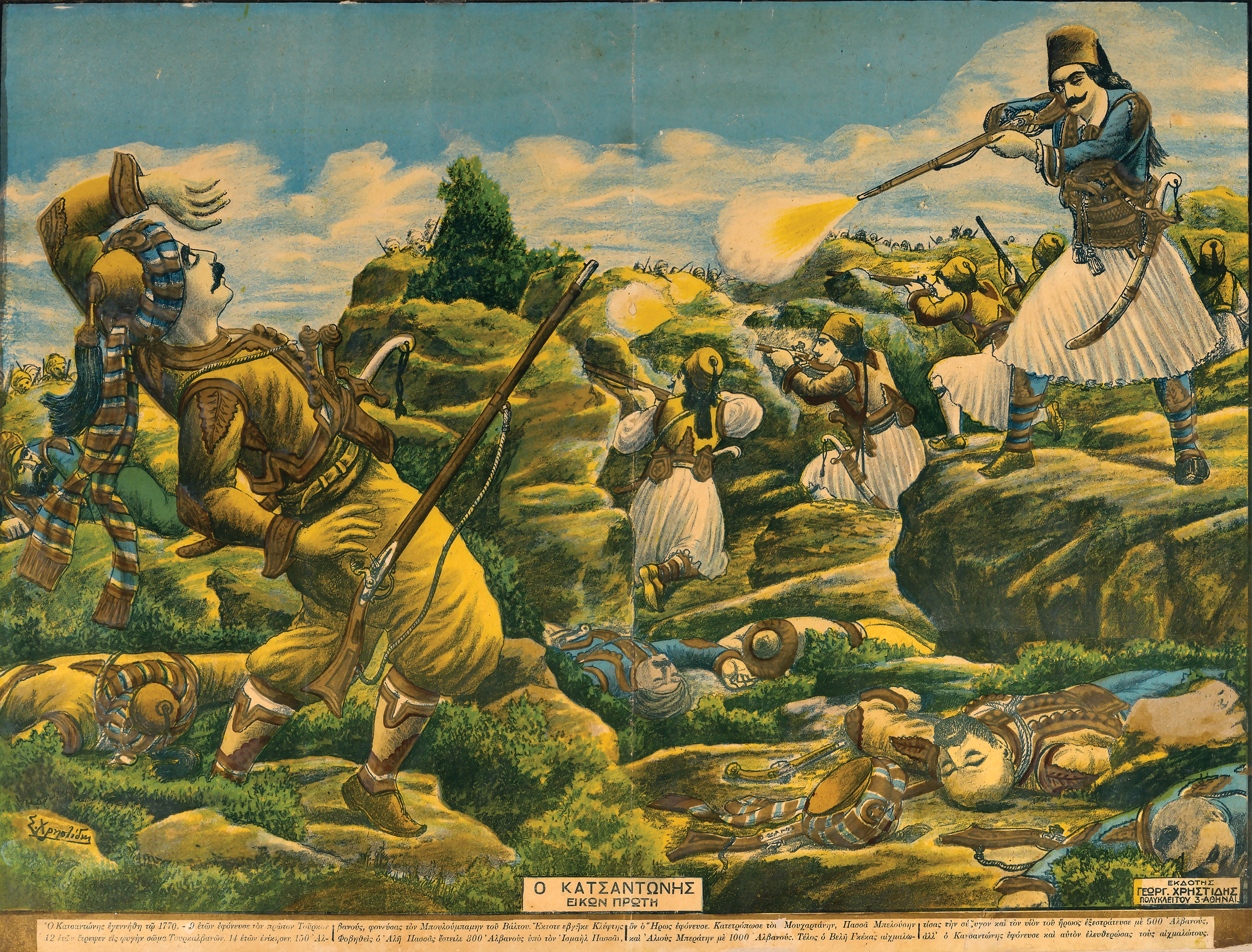 Περιγραφή: Χρωμολιθογραφία του Σ. Χρηστίδη, εκδοθείσα από τον ίδιο, με τίτλο: Ο ΚΑΤΣΑΝΤΩΝΗΣ. ΕΙΚΩΝ ΠΡΩΤΗ. Πολυπρόσωπη σύνθεση με τον ήρωα μαχόμενο εναντίον των Τούρκων. Κάτω από τη σύνθεση υπάρχει τετράστηλος υπομνηματισμός με στοιχεία από τη ζωή και τα κατορθώματα του Κατσαντώνη.