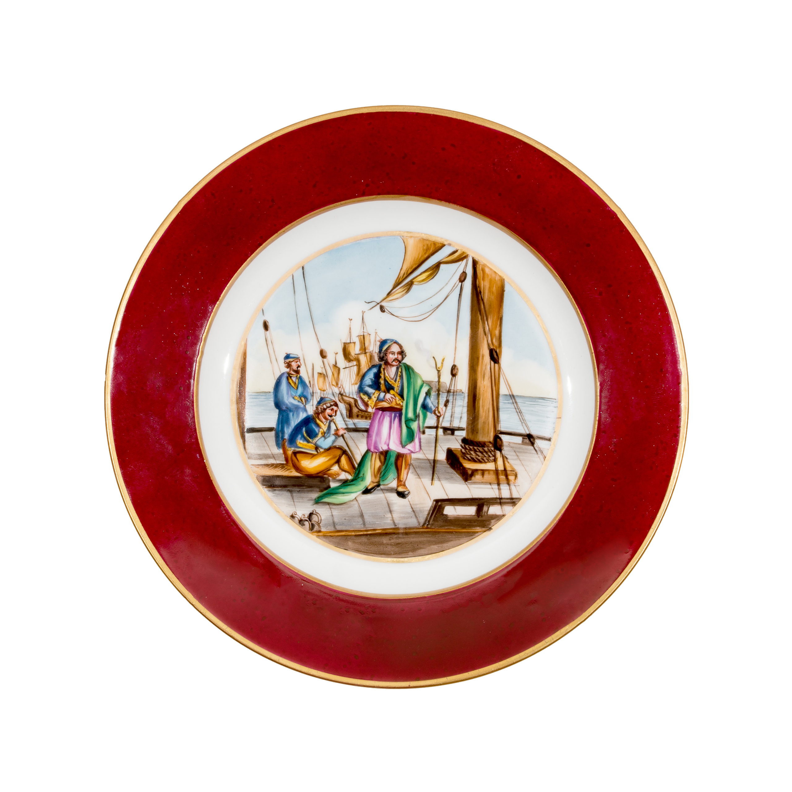 Περιγραφή: Πιάτο γαλλικό από πορσελάνη Limoges, πολύχρωμο με άσπρο φόντο, με μπορντό μπορντούρα και φιλελληνικό θέμα: Ο ΚΩΝΣΤΑΝΤΙΝΟΣ ΚΑΝΑΡΗΣ ΣΕ ΠΥΡΠΟΛΙΚΟ (χωρίς τίτλο) παρμένο από τη γνωστή λιθογραφία του Loeillot: Constantin Canaris sur un Brulot.