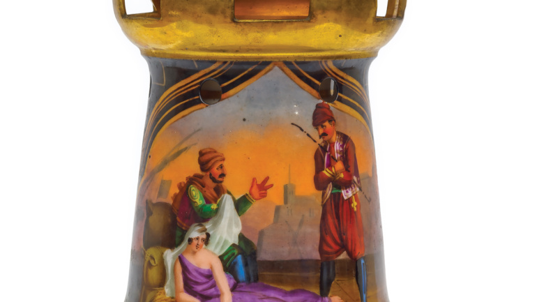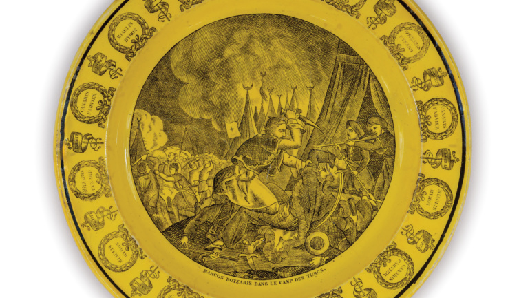 Περιγραφή: Πιάτο γαλλικό από πορσελάνη Limoges, πολύχρωμο με άσπρο φόντο, με μπορντό μπορντούρα και φιλελληνικό θέμα: Ο ΚΩΝΣΤΑΝΤΙΝΟΣ ΚΑΝΑΡΗΣ ΣΕ ΠΥΡΠΟΛΙΚΟ (χωρίς τίτλο) παρμένο από τη γνωστή λιθογραφία του Loeillot: Constantin Canaris sur un Brulot.