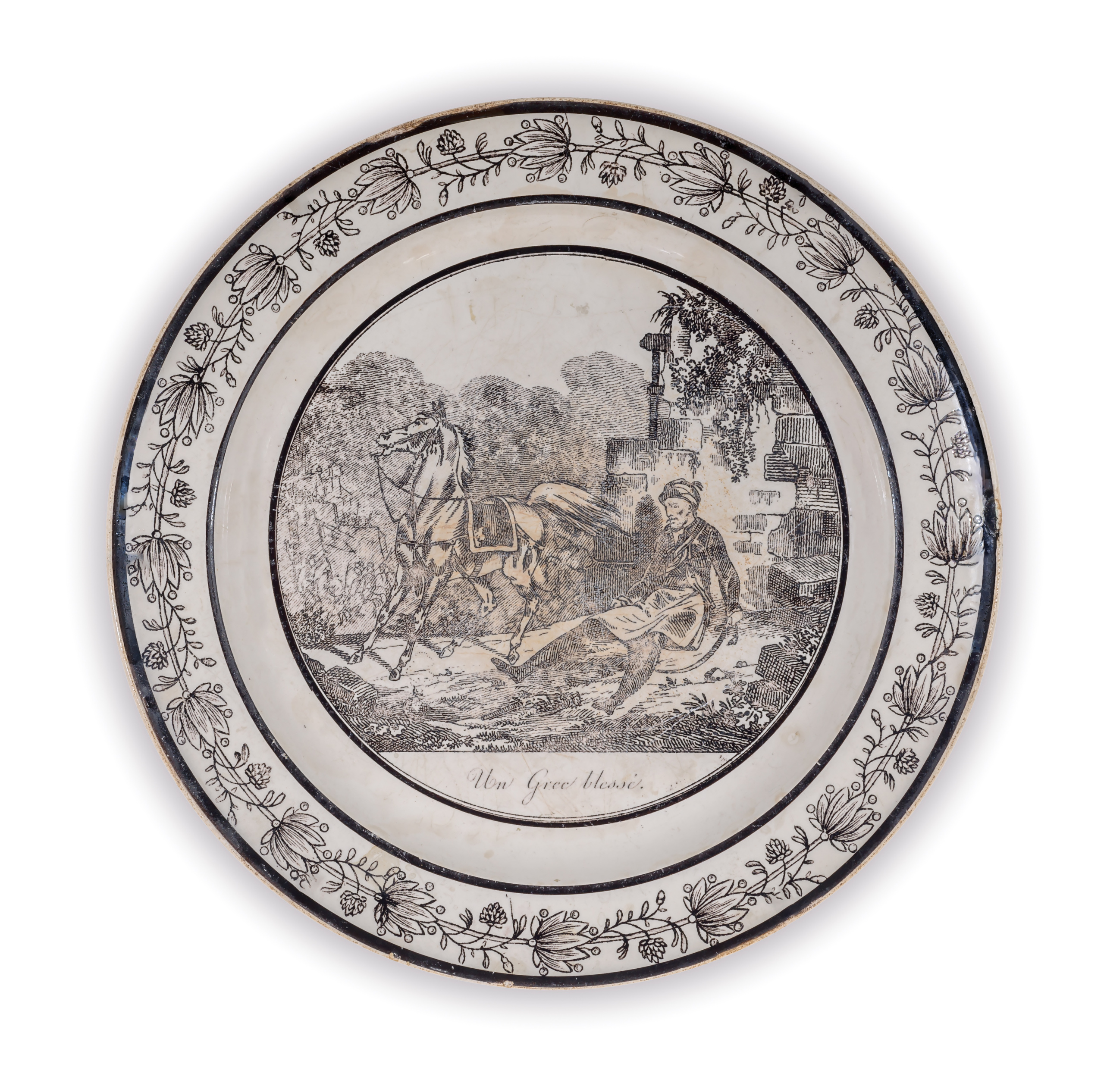 Περιγραφή: Πιάτο γαλλικό με φιλελληνική ασπρόμαυρη παράσταση: Λαβωμένος Έλληνας, Un Grec blessé. Πλαίσιο με γιρλάντα από φύλλα και καρπούς λυκίσκου. Στην πίσω πλευρά, σφραγίδα καρδιόσχημη: P&H CHOISY 10.