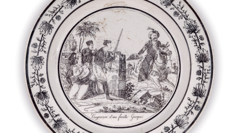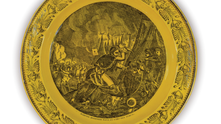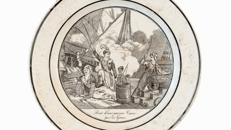 Περιγραφή: Πιάτο γαλλικό με φιλελληνική ασπρόμαυρη παράσταση: Λαβωμένος Έλληνας, Un Grec blessé. Πλαίσιο με γιρλάντα από φύλλα και καρπούς λυκίσκου. Στην πίσω πλευρά, σφραγίδα καρδιόσχημη: P&H CHOISY 10.