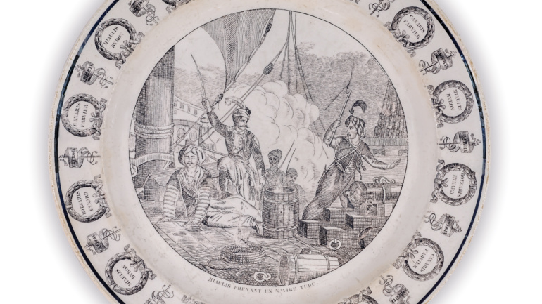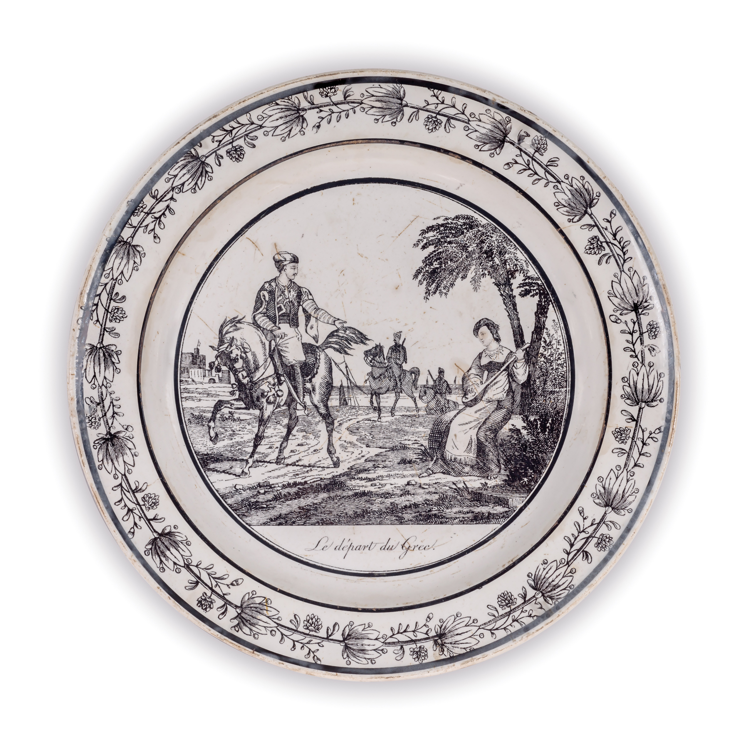 Περιγραφή: Πιάτο γαλλικό με φιλελληνική ασπρόμαυρη παράσταση: Η αναχώρηση του Έλληνα, Le départ du Grec. Πλαίσιο με γιρλάντα από φύλλα και καρπούς λυκίσκου. Στην πίσω πλευρά, σφραγίδα καρδιόσχημη (περίπου η μισή): …Η …ΟISY 23.