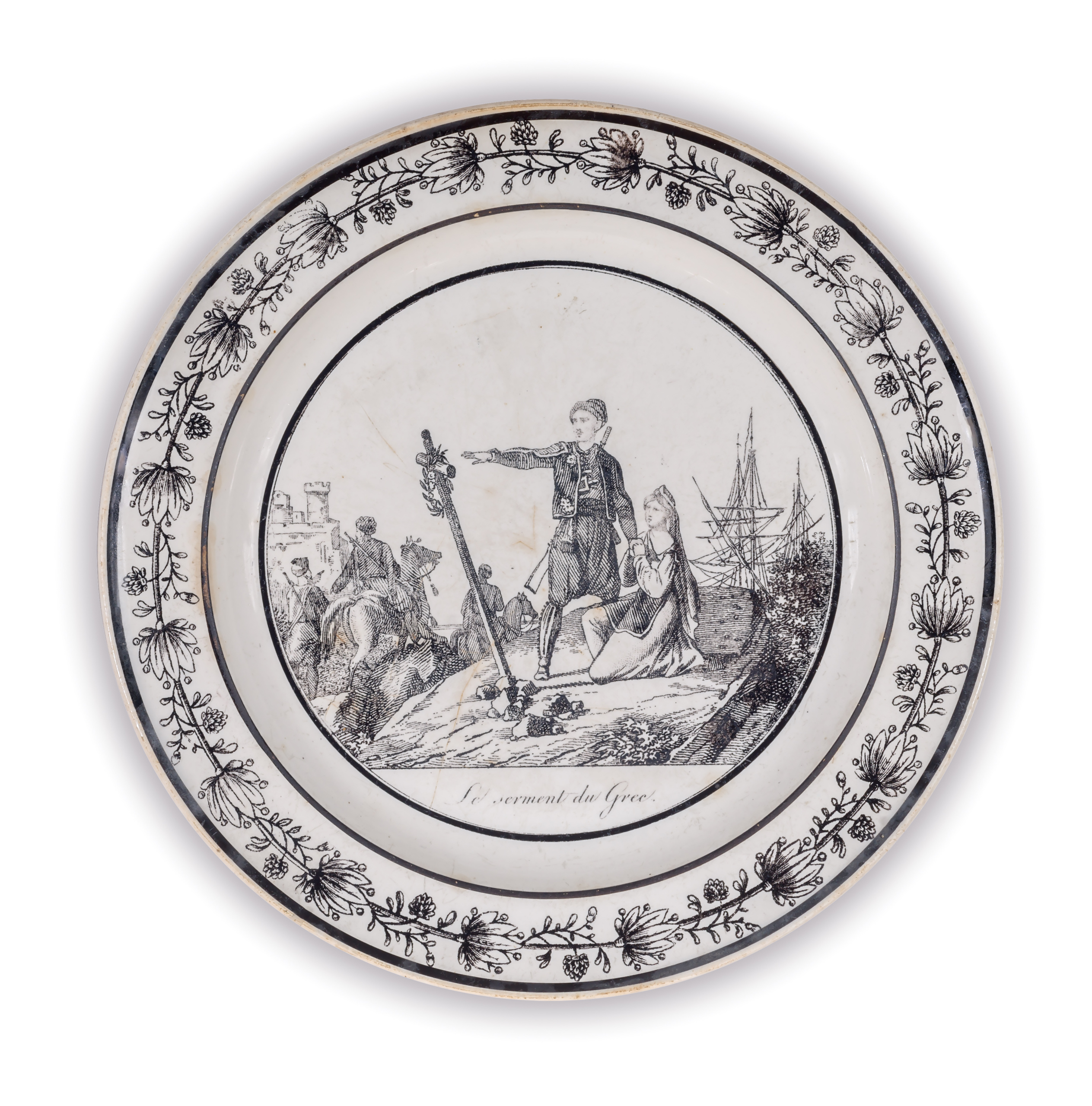 Περιγραφή: Πιάτο γαλλικό με φιλελληνική ασπρόμαυρη παράσταση: Ο όρκος του Έλληνα, Le serment du Grec. Πλαίσιο με γιρλάντα από φύλλα και καρπούς λυκίσκου. Στην πίσω πλευρά, σφραγίδα καρδιόσχημη: P&H CHOISY 10.