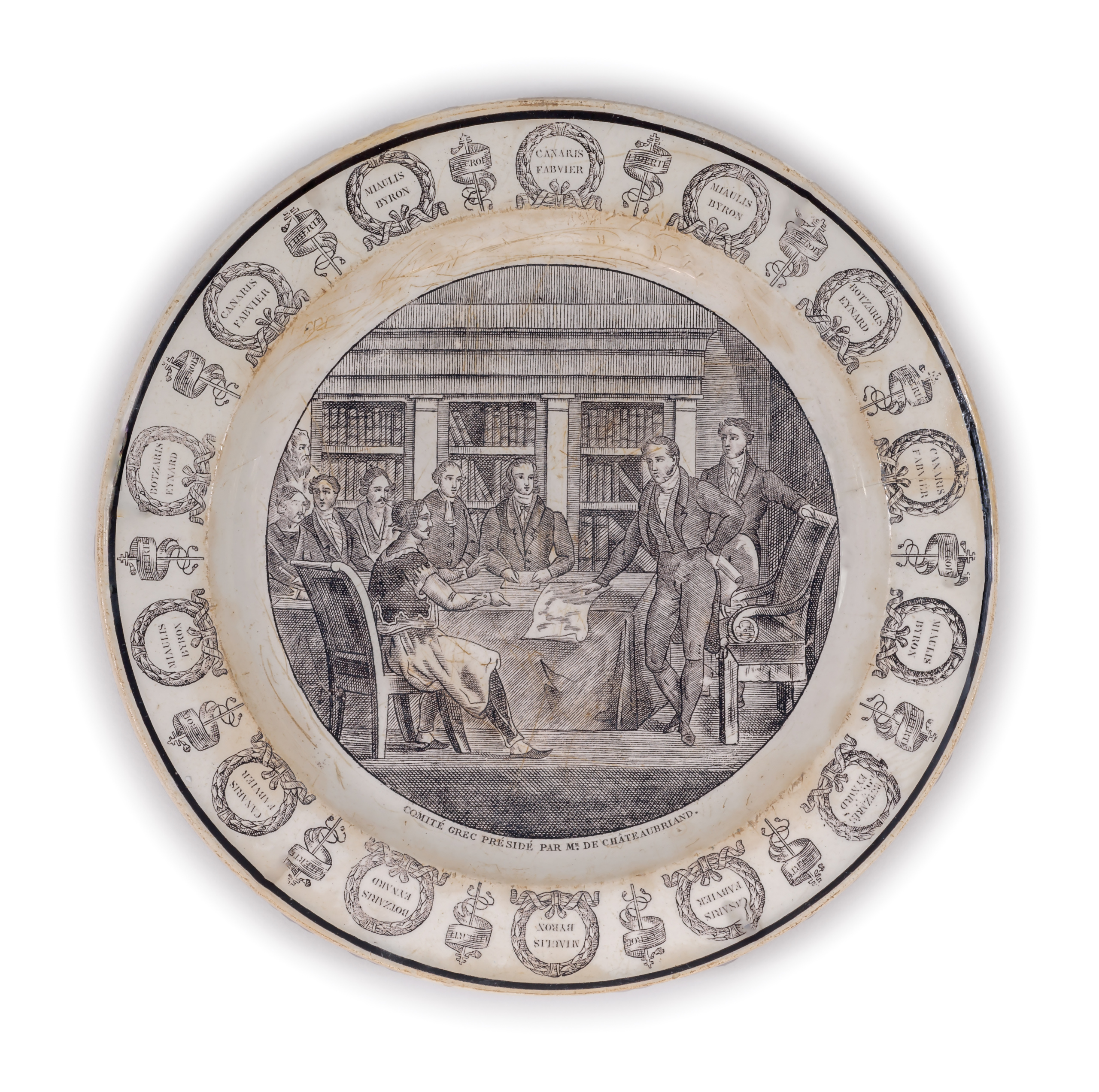 Περιγραφή: Πιάτο γαλλικό με φιλελληνική ασπρόμαυρη παράσταση: Ελληνικό Κομιτάτο με πρόεδρο τον Σατωβριάνδο, COMITE GREC PRESIDE PAR MR CHATEAUBRIAND. Πλαίσιο φιλελληνικό. (Οι κολώνες της βιβλιοθήκης χωρίς κατακόρυφες γραμμές). Στην πίσω πλευρά, σφραγίδα: LL&T και MONT…