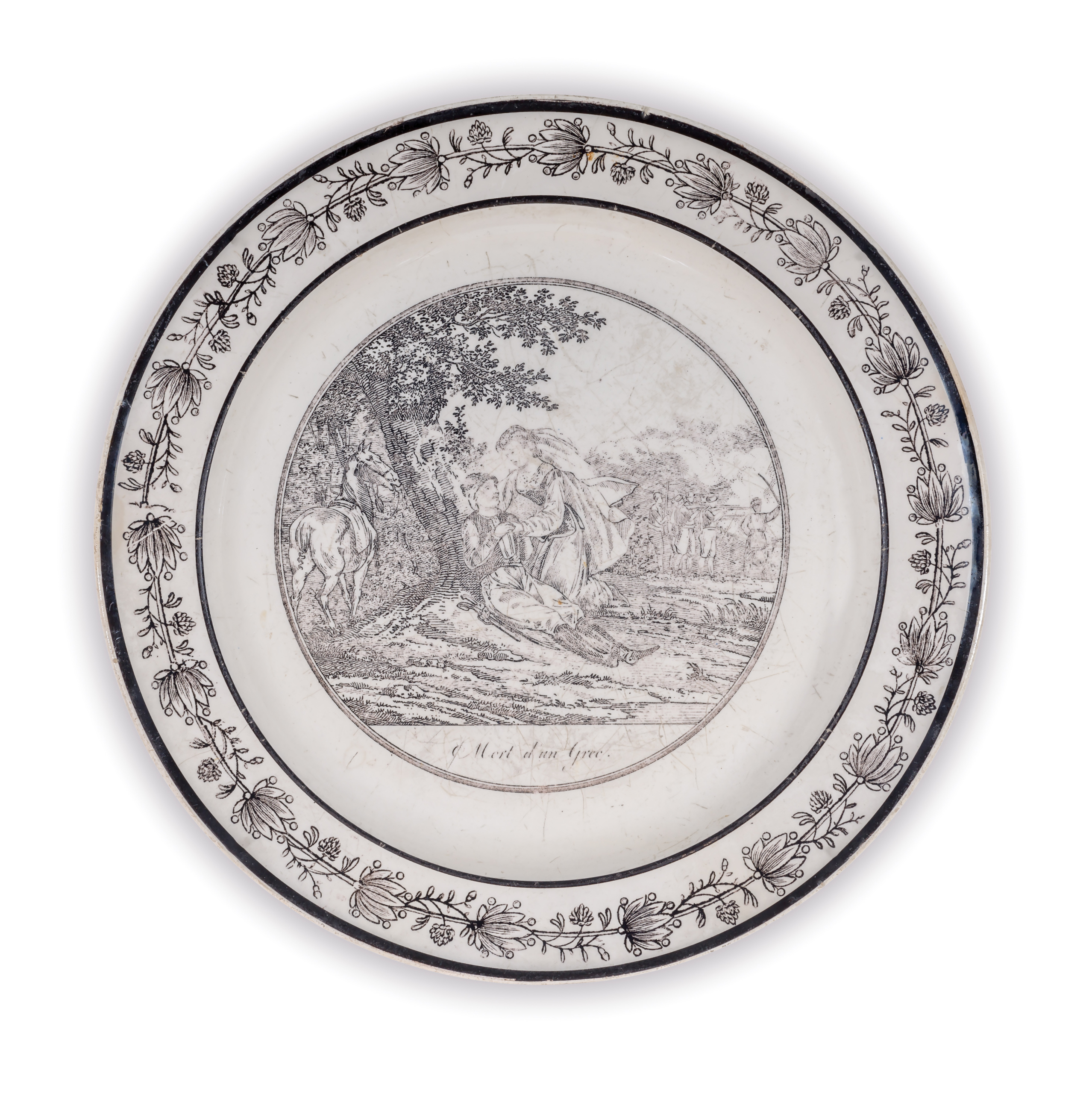 Περιγραφή: Πιάτο γαλλικό με φιλελληνική ασπρόμαυρη παράσταση: Θάνατος ενός Έλληνα, Μοrt d’un Grec. Πλαίσιο με γιρλάντα από φύλλα και καρπούς λυκίσκου. Στην πίσω πλευρά σφραγίδα καρδιόσχημη: P&H CHOISY 24.