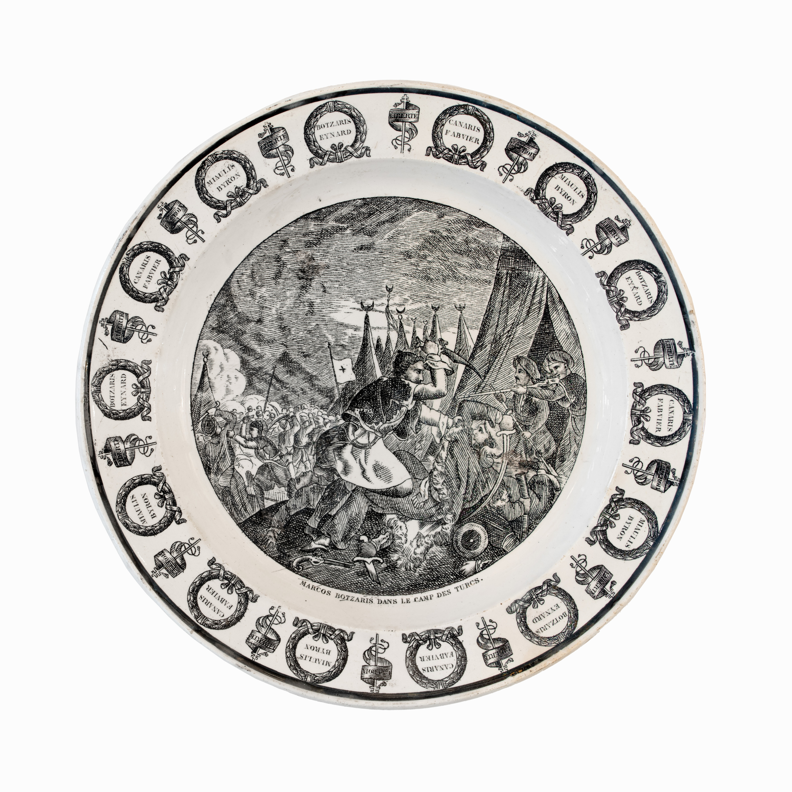 Περιγραφή: Πιάτο γαλλικό με φιλελληνική αασπρόμαυρη παράσταση: Ο Μάρκος Μπότσαρης στο στρατόπεδο των Τούρκων, MARCOS BOTZARIS DANS LE CAMP DES TURCS. Πλαίσιο φιλελληνικό.