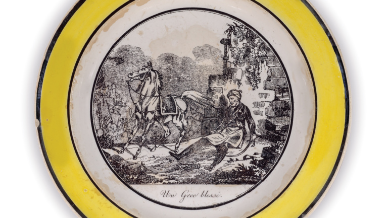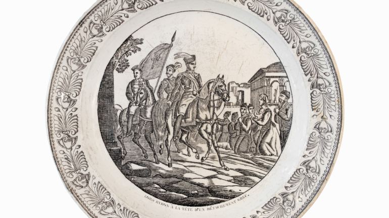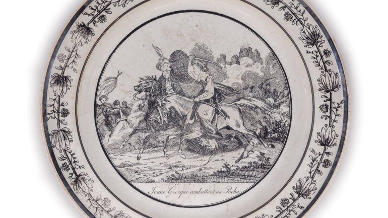 Περιγραφή: Πιάτο γαλλικό με φιλελληνική αασπρόμαυρη παράσταση: Ο Μάρκος Μπότσαρης στο στρατόπεδο των Τούρκων, MARCOS BOTZARIS DANS LE CAMP DES TURCS. Πλαίσιο φιλελληνικό.