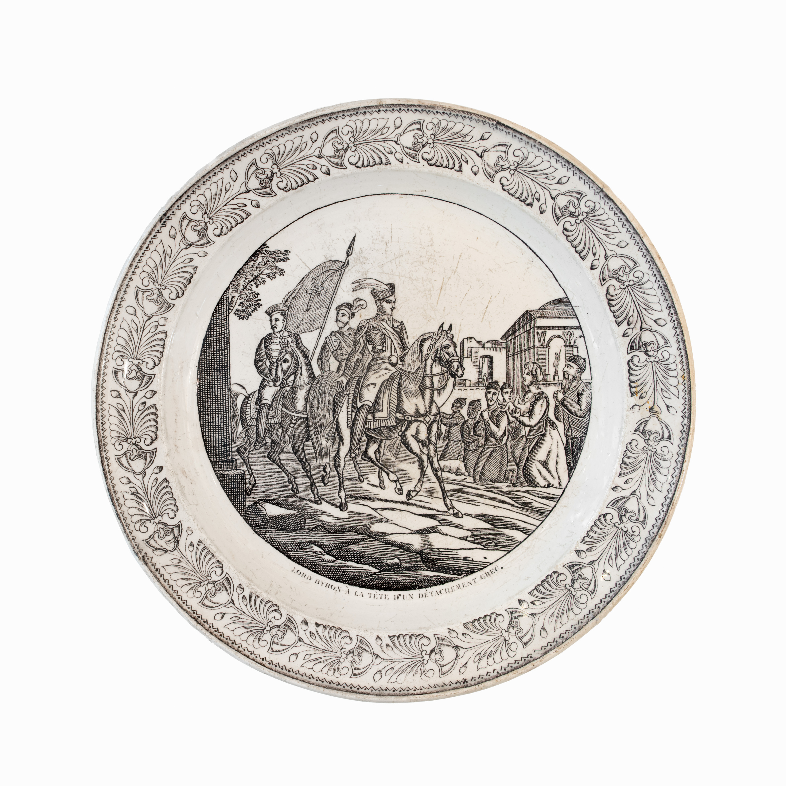 Περιγραφή: Πιάτο γαλλικό με φιλελληνική ασπρόμαυρη παράσταση: Ο Λόρδος Βύρων επικεφαλής ελληνικού αποσπάσματος, LORD BYRON A LA TÊTE D’UN DETACHEMENT GREC. Πλαίσιο από σχηματοποιημένα ανθέμια. Στην πίσω πλευρά, σφραγίδα: LL&T MONT…