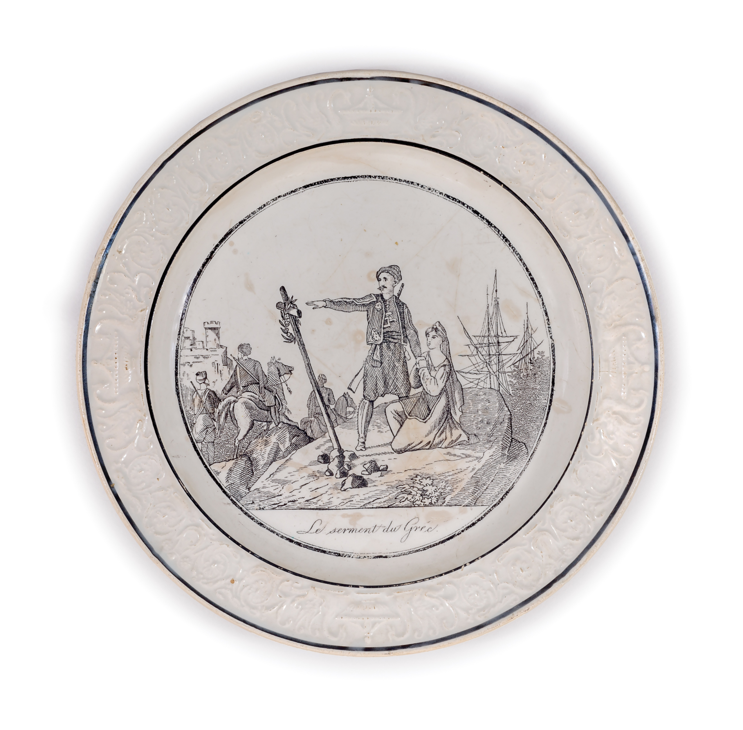 Περιγραφή: Πιάτο γαλλικό με φιλελληνική ασπρόμαυρη παράσταση: Ο όρκος του Έλληνα, Le serment du Grec. Πλαίσιο από ανάγλυφη νεοκλασική ταινία. Στην πίσω πλευρά, σφραγίδα καρδιόσχημη: P&H CHOISY 27.