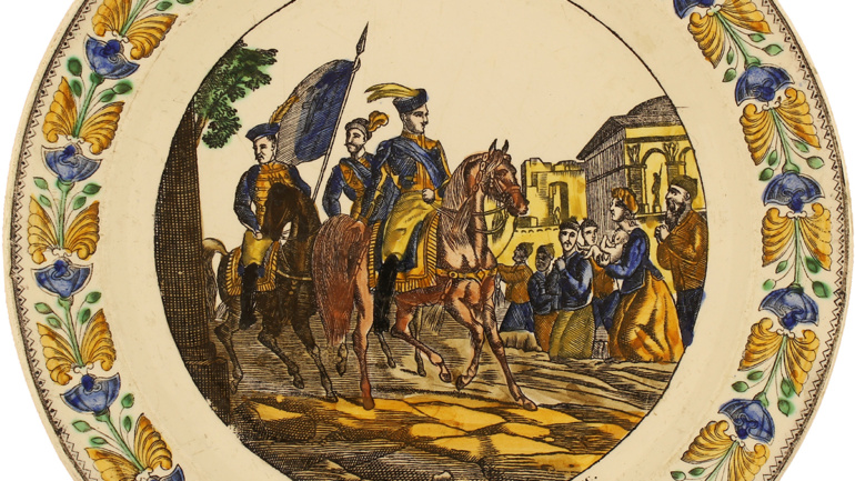 Περιγραφή: Πιάτο γαλλικό με φιλελληνική ασπρόμαυρη παράσταση: Ο όρκος του Έλληνα, Le serment du Grec. Πλαίσιο από ανάγλυφη νεοκλασική ταινία. Στην πίσω πλευρά, σφραγίδα καρδιόσχημη: P&H CHOISY 27.