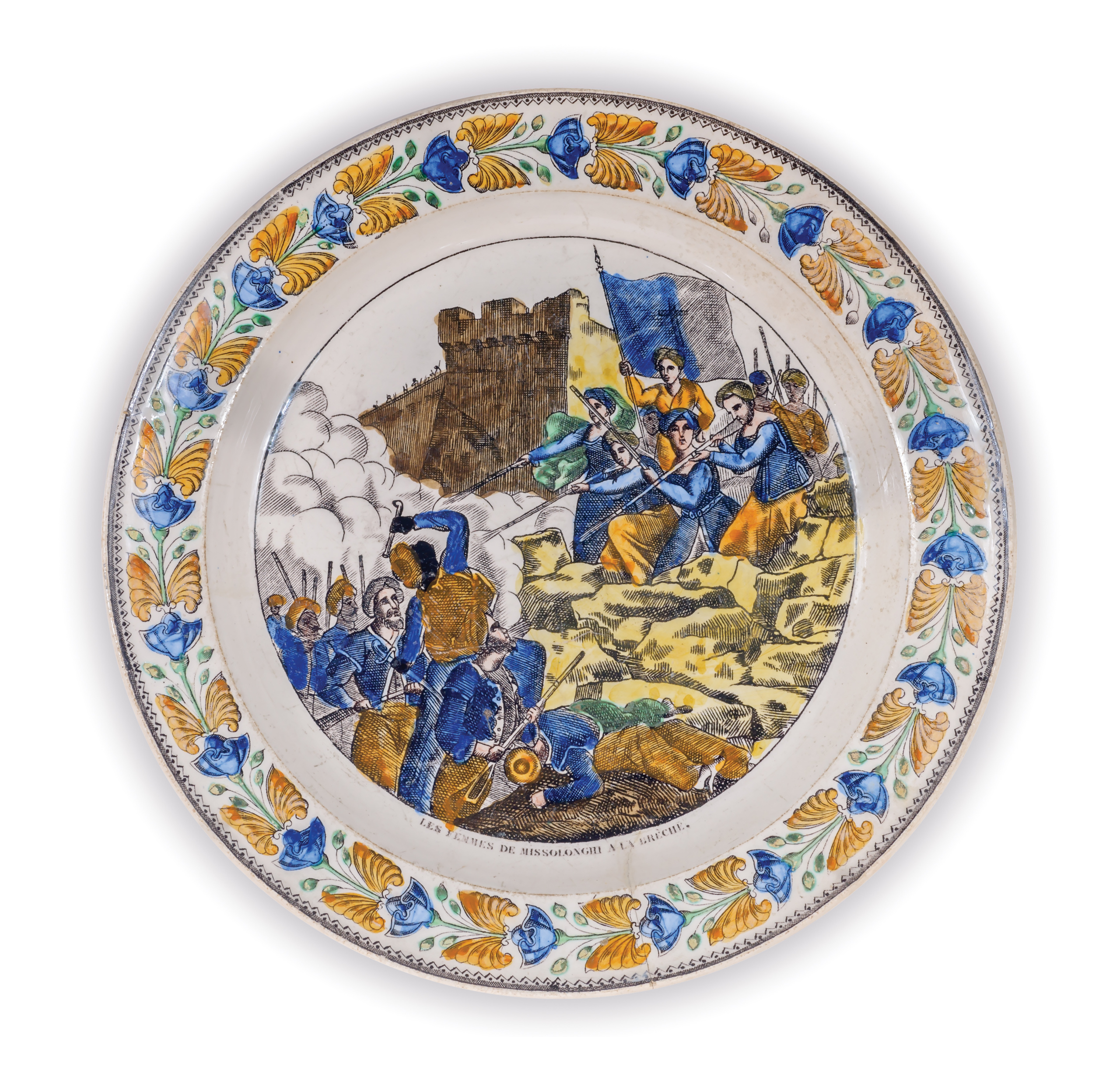 Περιγραφή: Πιάτο γαλλικό με φιλελληνική πολύχρωμη παράσταση: Οι γυναίκες του Μεσολογγίου στη μάχη, LES FEMMES DE MISSOLONGHI A LA BRECHE. Πλαίσιο από σχηματοποιημένα ανθέμια. Στην πίσω πλευρά, σφραγίδα: LL&MONT.
