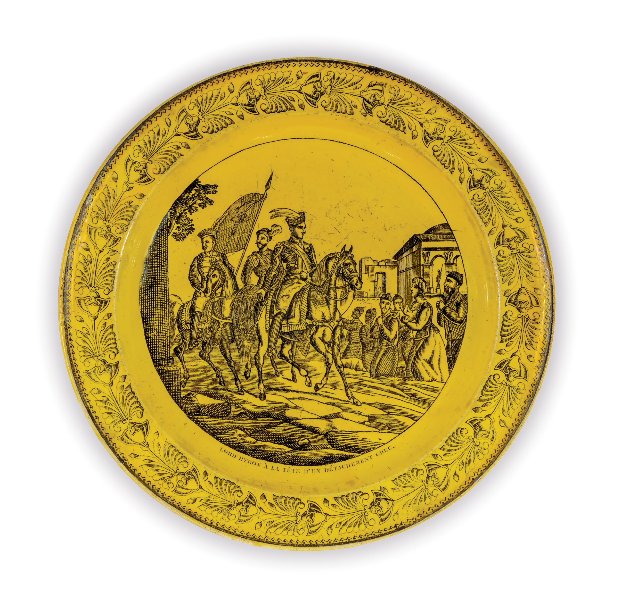Περιγραφή: Πιάτο γαλλικό με φιλελληνική μαύρη παράσταση σε κίτρινο φόντο: Ο Λόρδος Βύρων επικεφαλής ελληνικού αποσπάσματος, LORD BYRON A LA TETE D’UN DETACHEMENT GREC. Πλαίσιο από σχηματοποιημένα ανθέμια. Στην πίσω πλευρά, σφραγίδα: LL&T MONTAU 11.