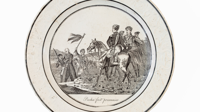 Περιγραφή: Πιάτο γαλλικό με φιλελληνική μαύρη παράσταση σε κίτρινο φόντο: Ο Λόρδος Βύρων επικεφαλής ελληνικού αποσπάσματος, LORD BYRON A LA TETE D’UN DETACHEMENT GREC. Πλαίσιο από σχηματοποιημένα ανθέμια. Στην πίσω πλευρά, σφραγίδα: LL&T MONTAU 11.