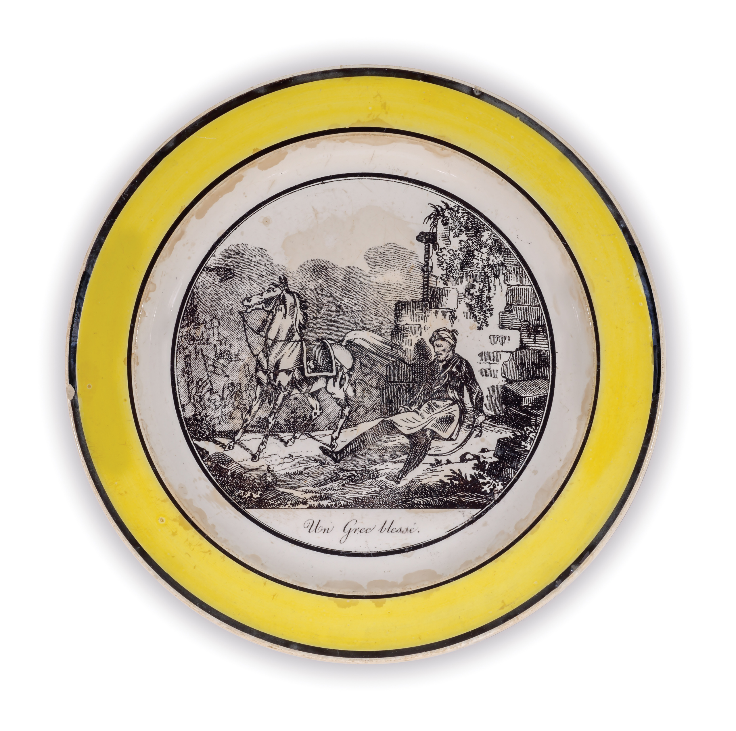 Περιγραφή: Πιάτο γαλλικό με φιλελληνική ασπρόμαυρη παράσταση: Λαβωμένος Έλληνας, Un Grec blessé. Πλαίσιο από κίτρινη ταινία. Στην πίσω πλευρά, σφραγίδα καρδιόσχημη: P&H CHOISY 18.
