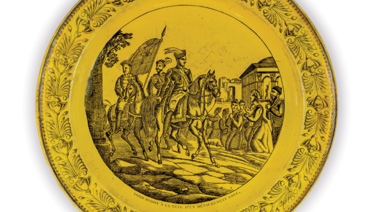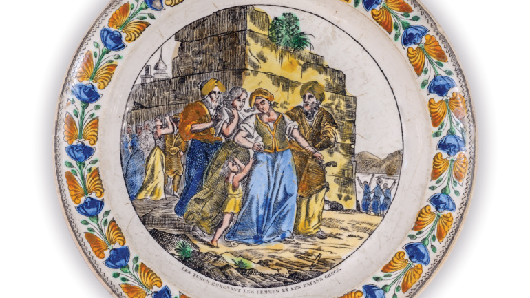Περιγραφή: Πιάτο γαλλικό με φιλελληνική ασπρόμαυρη παράσταση: Λαβωμένος Έλληνας, Un Grec blessé. Πλαίσιο από κίτρινη ταινία. Στην πίσω πλευρά, σφραγίδα καρδιόσχημη: P&H CHOISY 18.