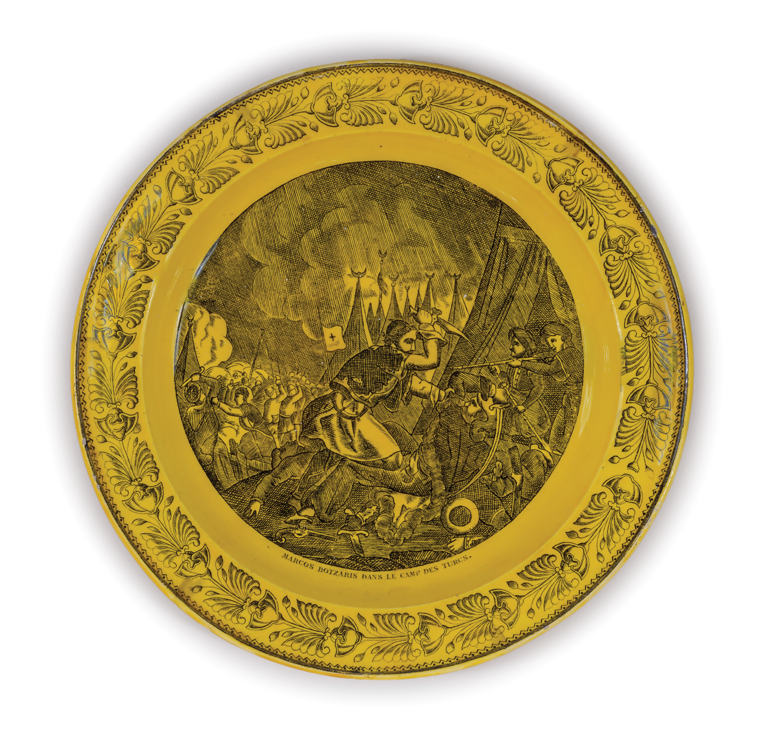 Περιγραφή: Πιάτο γαλλικό με φιλελληνική μαύρη παράσταση σε κίτρινο φόντο: Ο Μάρκος Μπότσαρης στο στρατόπεδο των Τούρκων, MARCOS BOTZARIS DANS LE CAMP DES TURCS. Πλαίσιο από σχηματοποιημένα ανθέμια. Στην πίσω πλευρά, σφραγίδα: LL&T MONTAU 1.