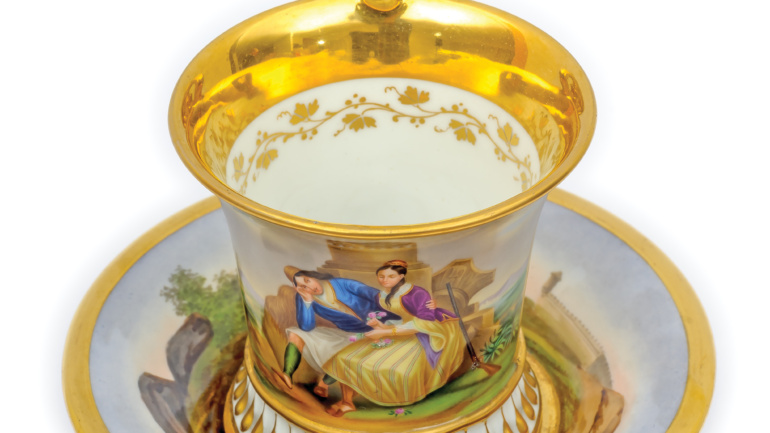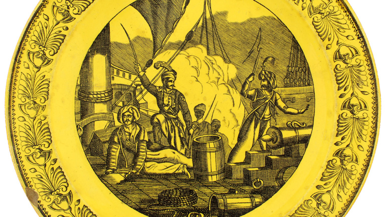 Περιγραφή: Πιάτο γαλλικό με φιλελληνική μαύρη παράσταση σε κίτρινο φόντο: Ο Μάρκος Μπότσαρης στο στρατόπεδο των Τούρκων, MARCOS BOTZARIS DANS LE CAMP DES TURCS. Πλαίσιο από σχηματοποιημένα ανθέμια. Στην πίσω πλευρά, σφραγίδα: LL&T MONTAU 1.
