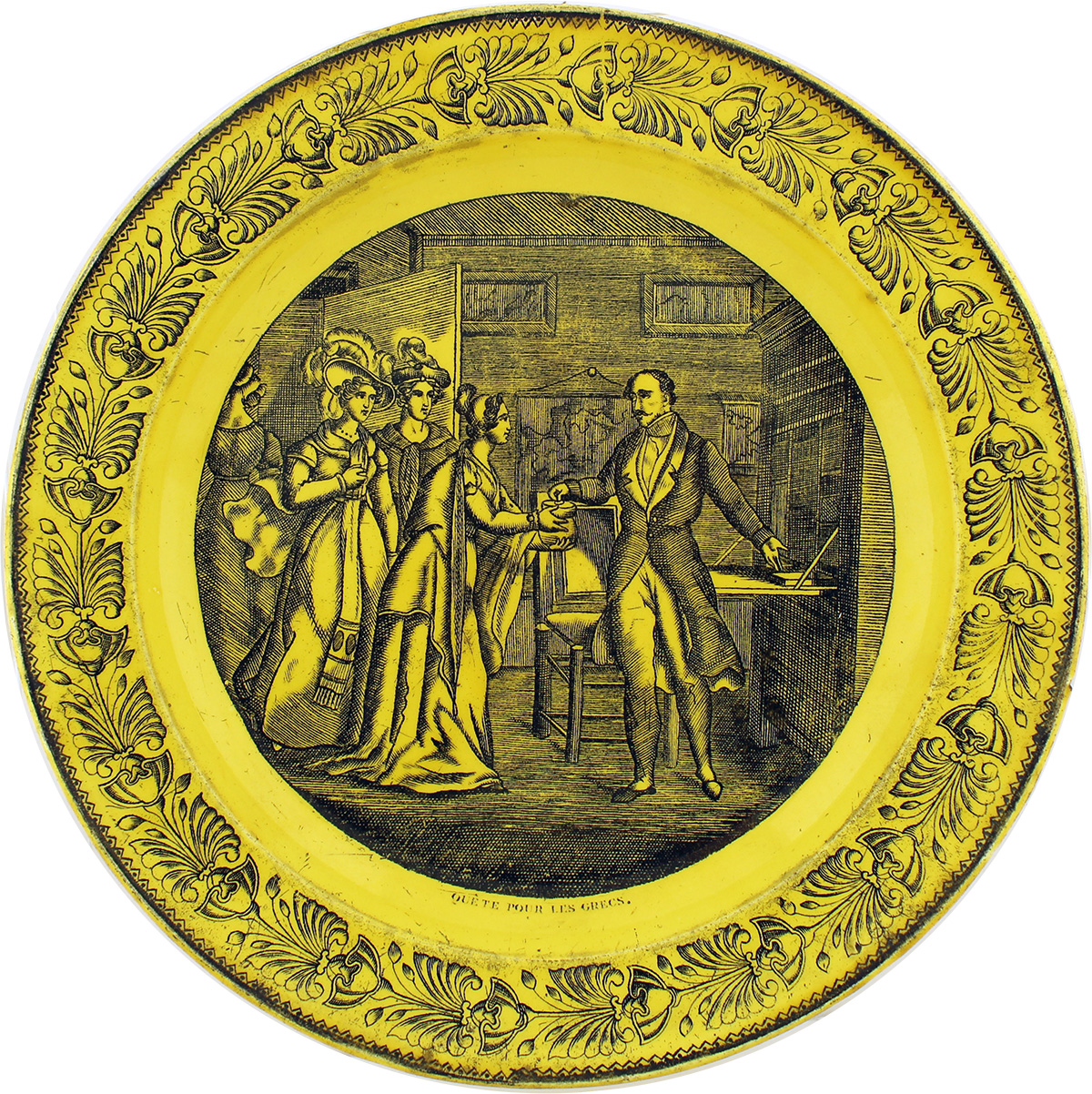 Περιγραφή: Πιάτο γαλλικό με φιλελληνική μαύρη παράσταση σε κίτρινο φόντο: Έρανος υπέρ των Ελλήνων, QUÊTE POUR LES GRECS. Πλαίσιο από σχηματοποιημένα ανθέμια. Στην πίσω πλευρά, εμπίεστη σφραγίδα δυσανάγνωστη.