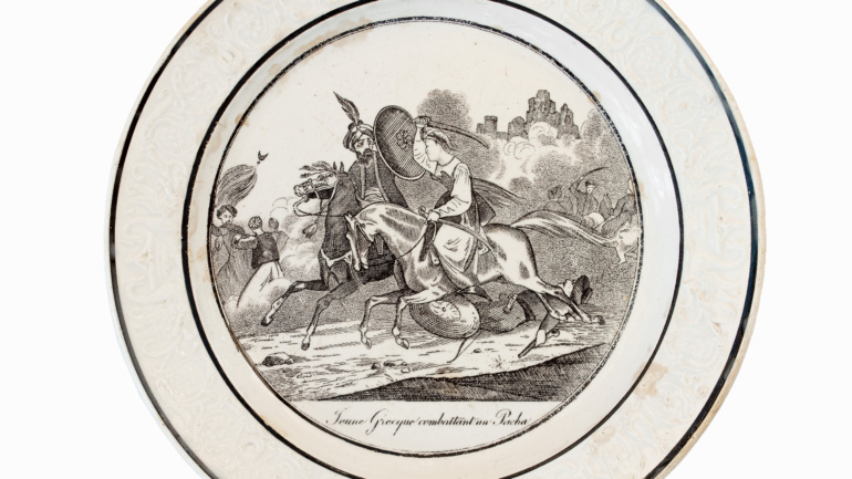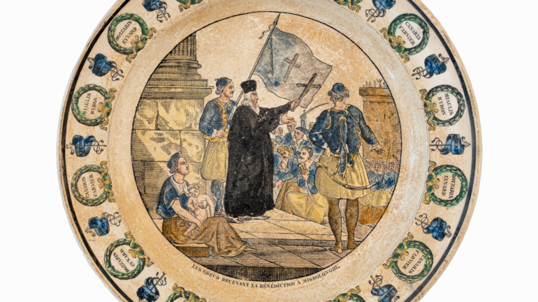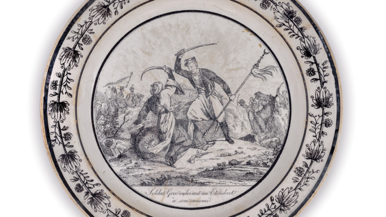 Περιγραφή: Πιάτο γαλλικό με φιλελληνική μαύρη παράσταση σε κίτρινο φόντο: Έρανος υπέρ των Ελλήνων, QUÊTE POUR LES GRECS. Πλαίσιο από σχηματοποιημένα ανθέμια. Στην πίσω πλευρά, εμπίεστη σφραγίδα δυσανάγνωστη.
