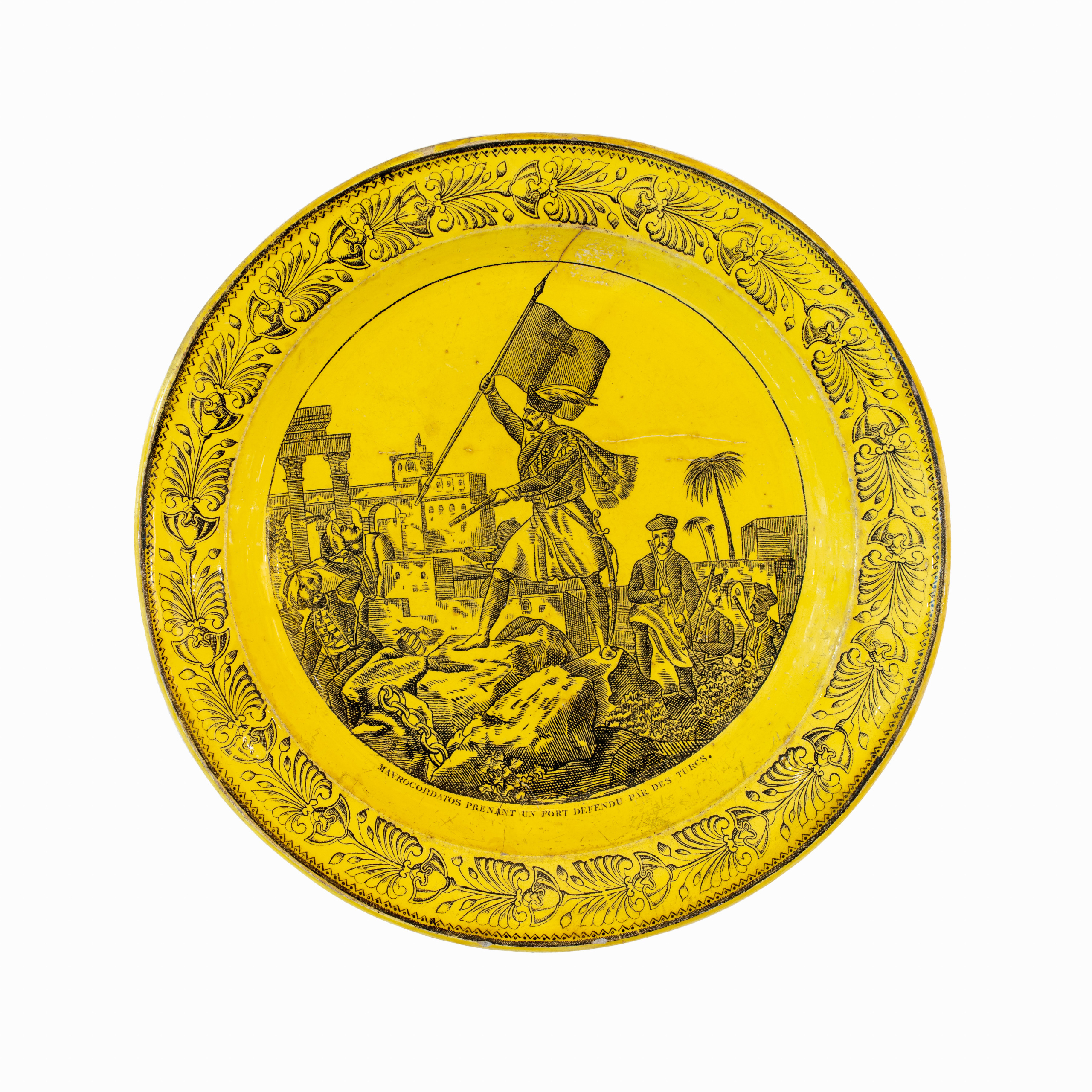 Περιγραφή: Πιάτο γαλλικό με φιλελληνική μαύρη παράσταση σε κίτρινο φόντο: Άλωση τουρκικού φρουρίου από τον Μαυροκορδάτο, MAVROCORDATOS PRENANT UN FORT DEFENDU PAR DES TURCS. Πλαίσιο από σχηματοποιημένα ανθέμια. Στην πίσω πλευρά, σφραγίδα: LL&T MONT…